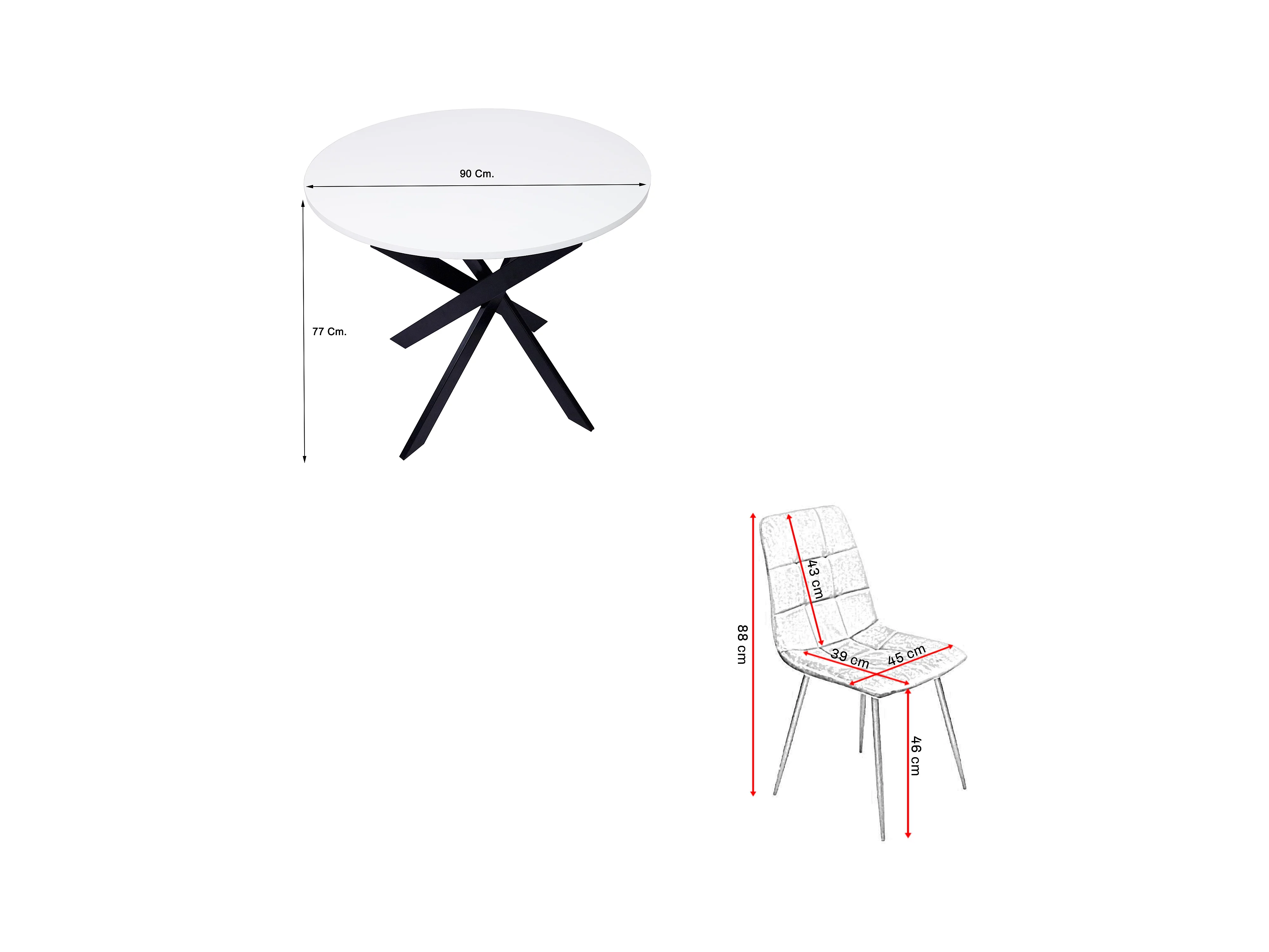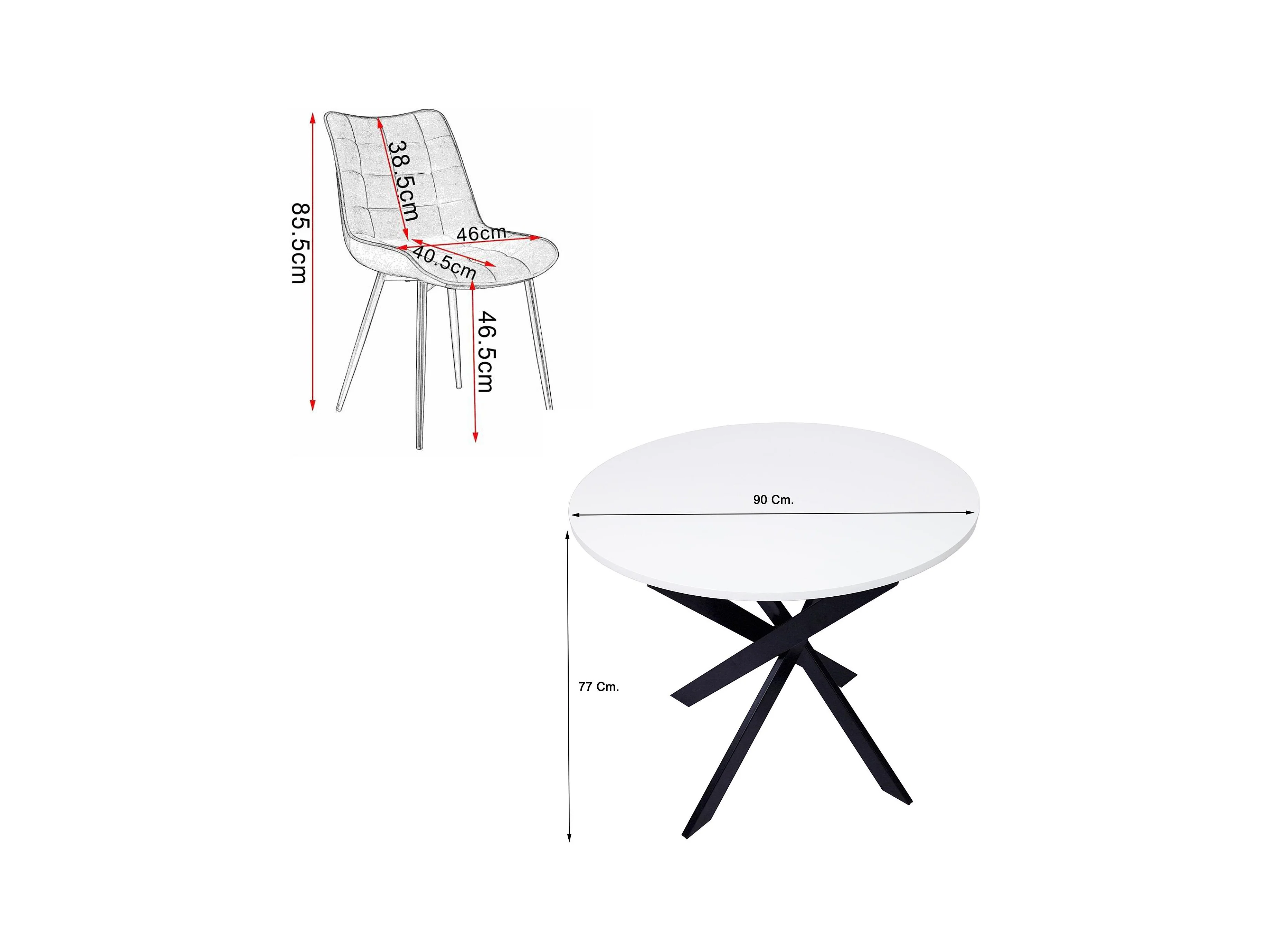 Conjunto móveis, Conjunto de 4 Cadeiras de Jantar, Cadeira Estofada, Cadeiras, Mesa Jantar fixa redonda, Branco mate, Pés pretos