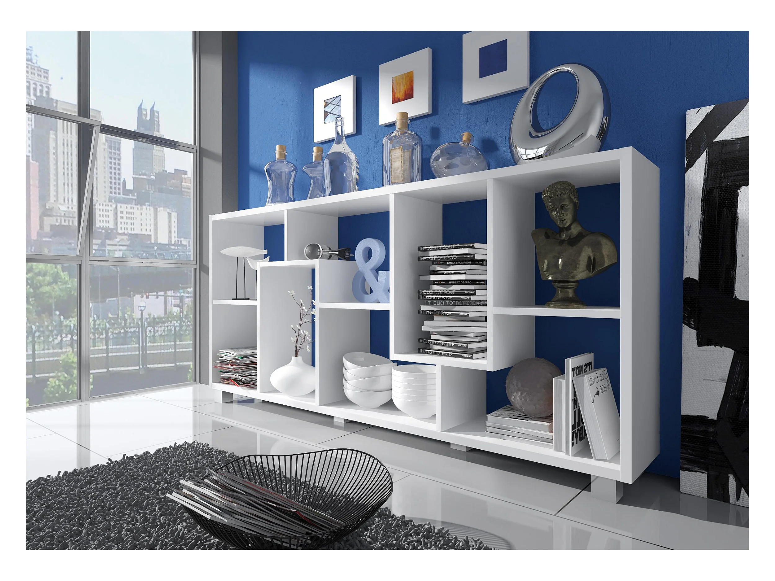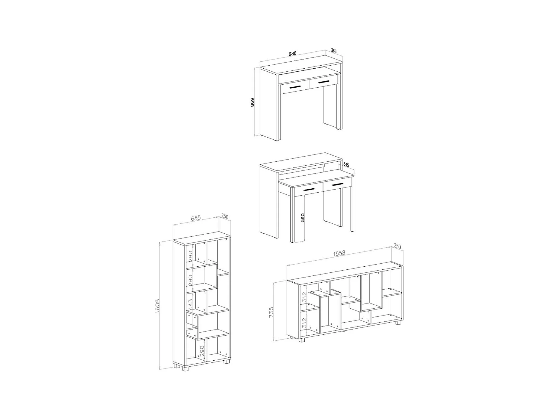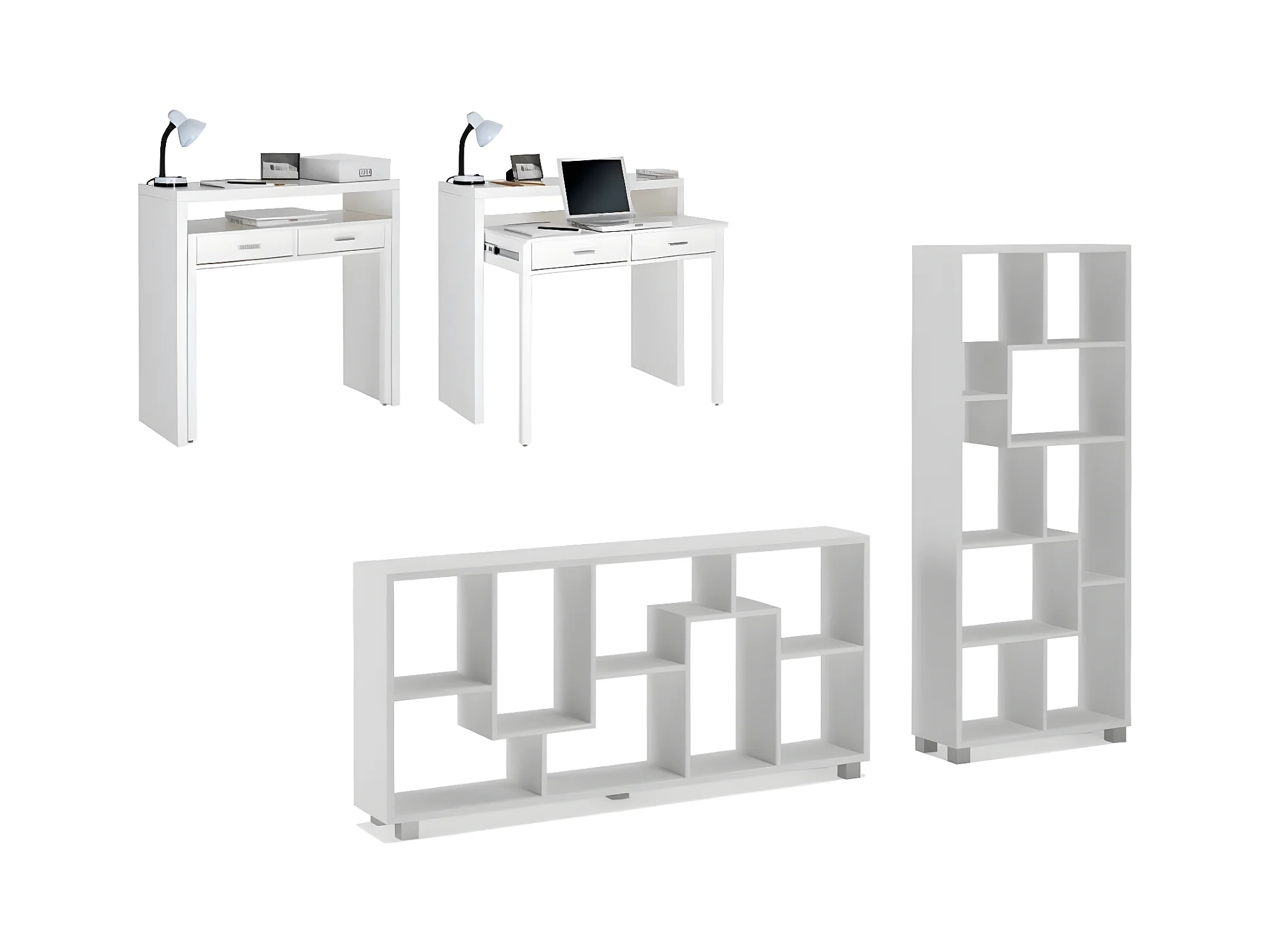 Conjunto Secretária extensível, Estante de livros de cor branca.