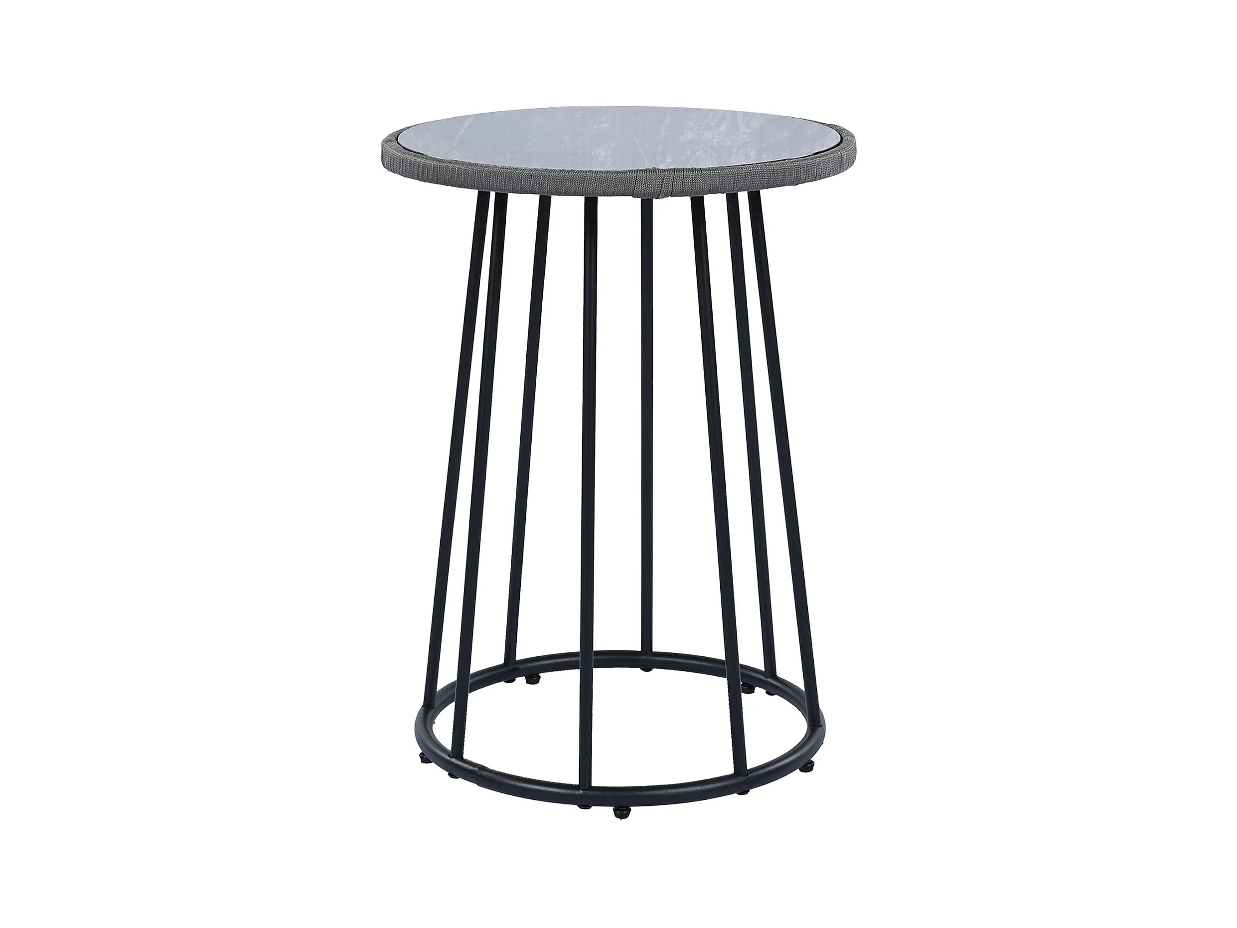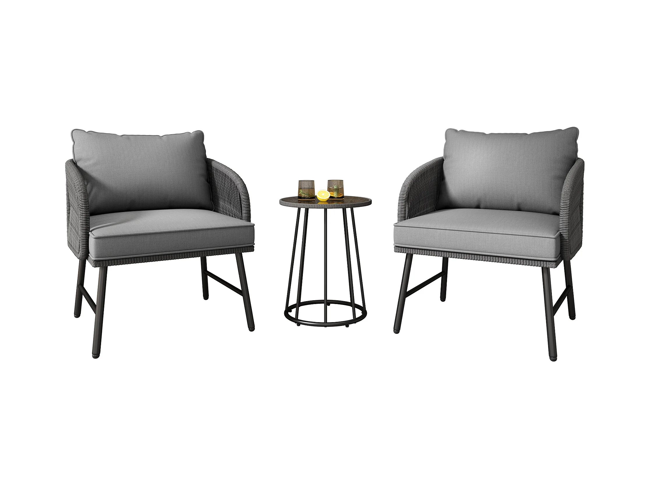 Conjuntos de salão de jardim bistrô de 3 peças, 2 poltronas + mesa baixa, corda trançada, tampo de mesa de vidro, Cinza