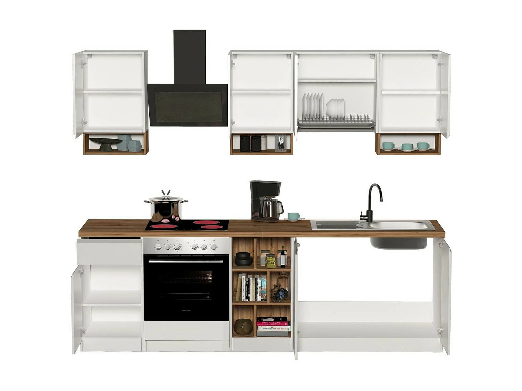 Cozinha completa Dcelient, Conjunto com despensa, Armário de cozinha, Kit de bloco linear, 100% Fabricado em Itália, 255x60h85 cm, Branco brilhante e carvalho