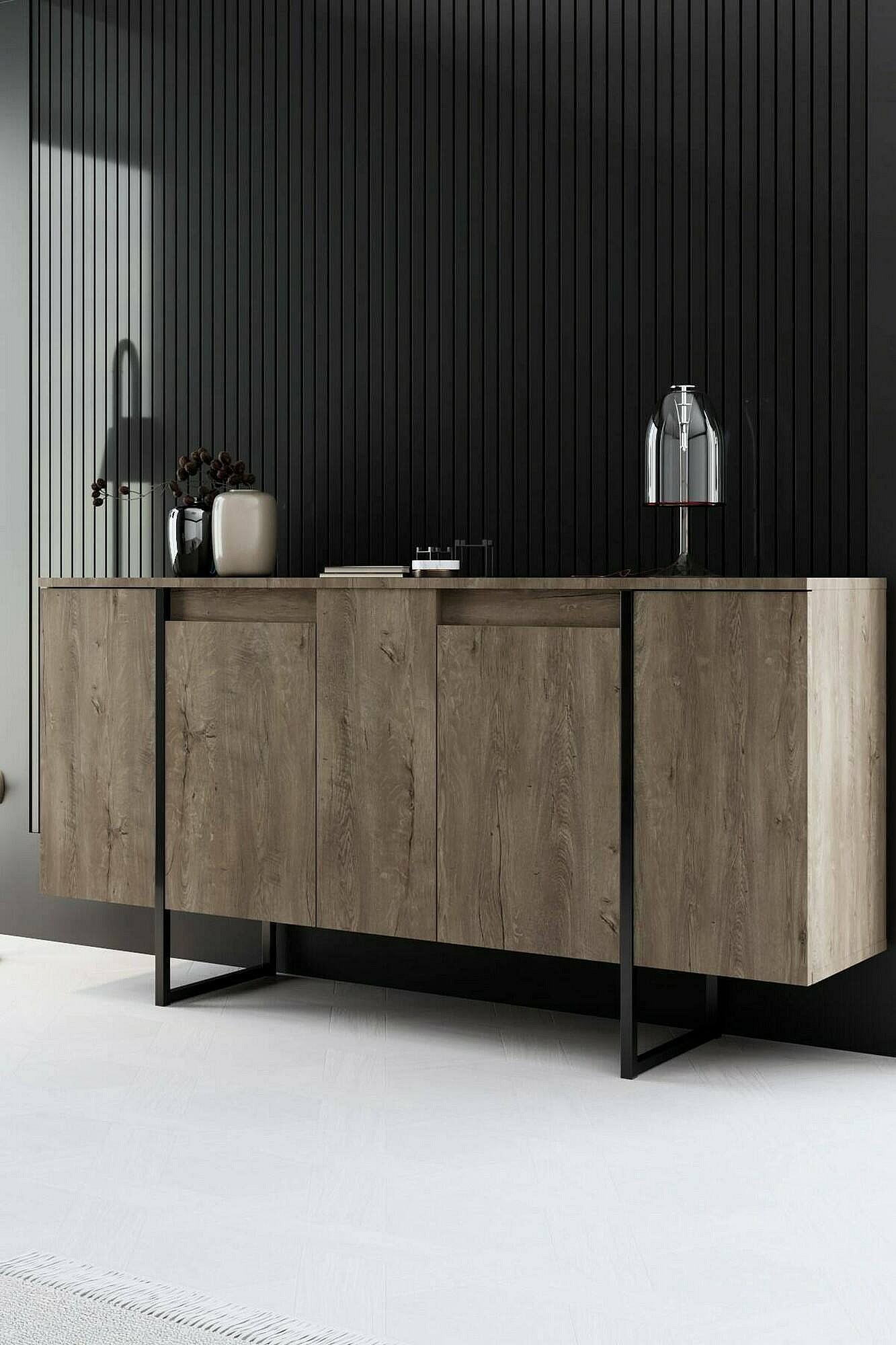 Credenza Dgarzitt, BuFfet de sala de estar, forma de sala de estar, despensa de cozinha, 160x35h80 cm, nogueira e preto