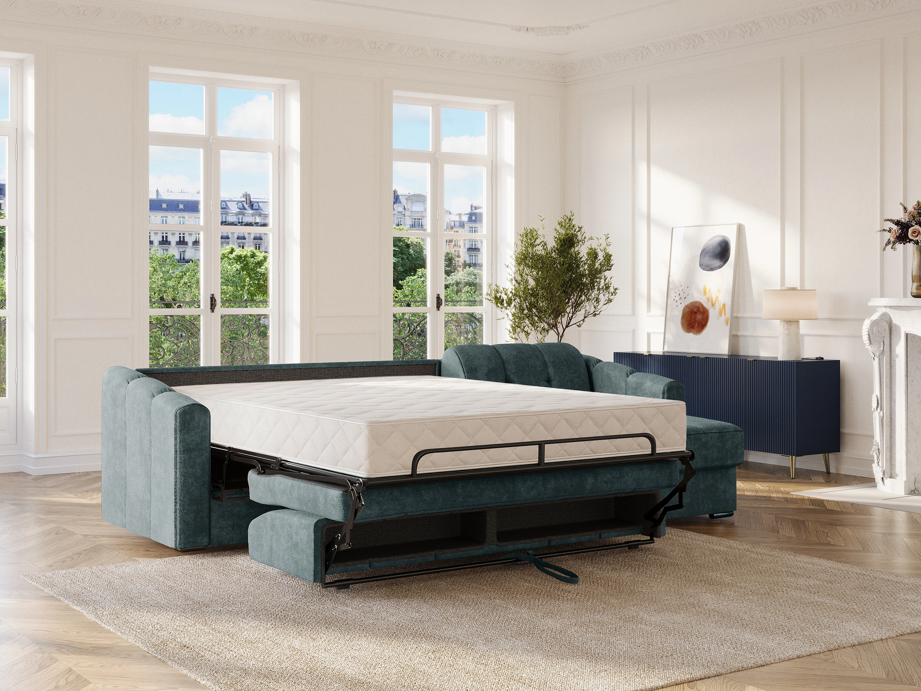 Sofá de canto convertível abertura rápida em tecido texturizado azul pato - Cama ripas largas 160 cm - Colchão 22 cm com memória de forma - DARIELO