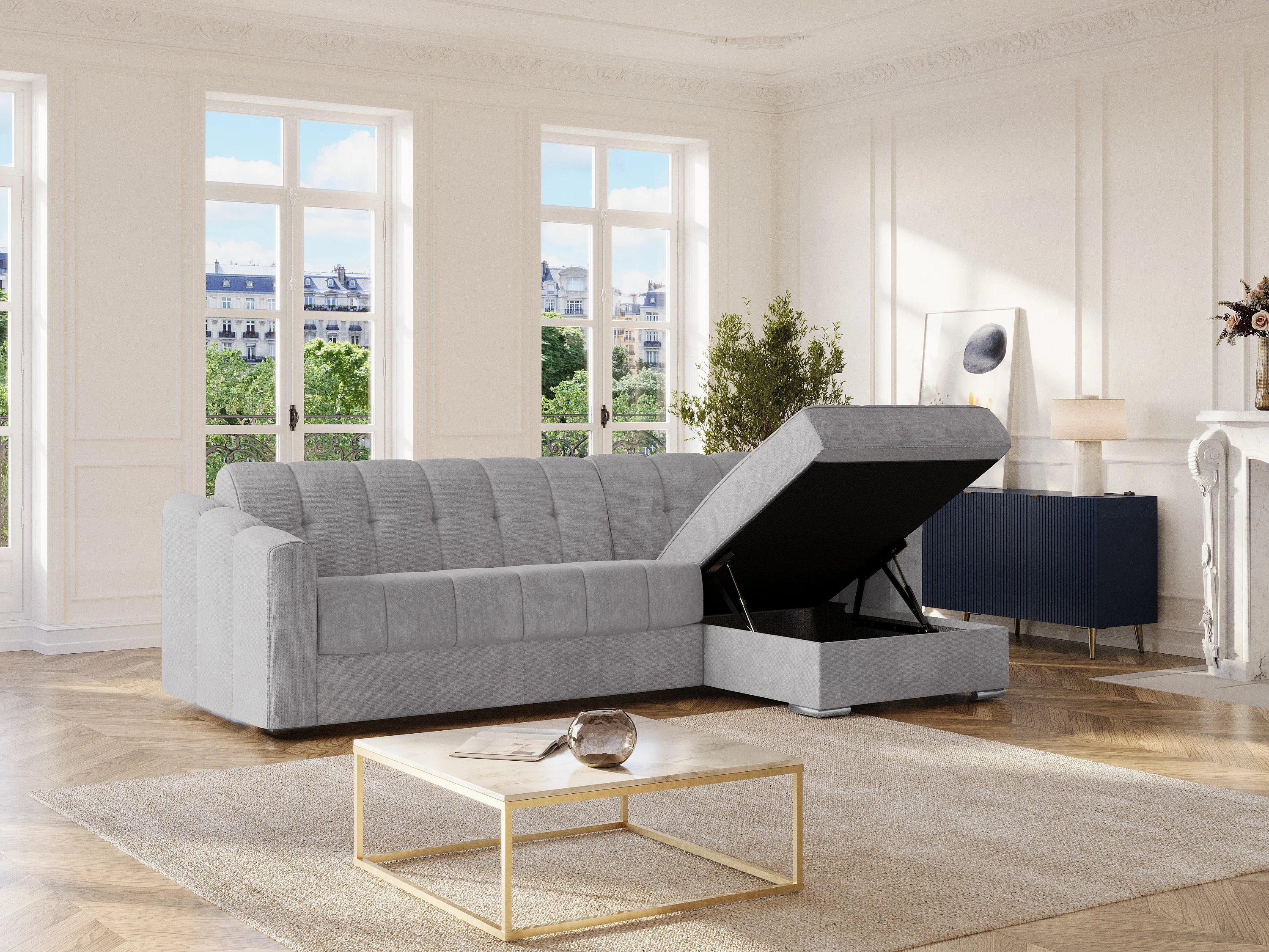 Sofá de canto convertível abertura rápida em tecido texturizado cinzento claro - Cama ripas largas 160 cm - Colchão 22 cm com memória de forma - DARIELO