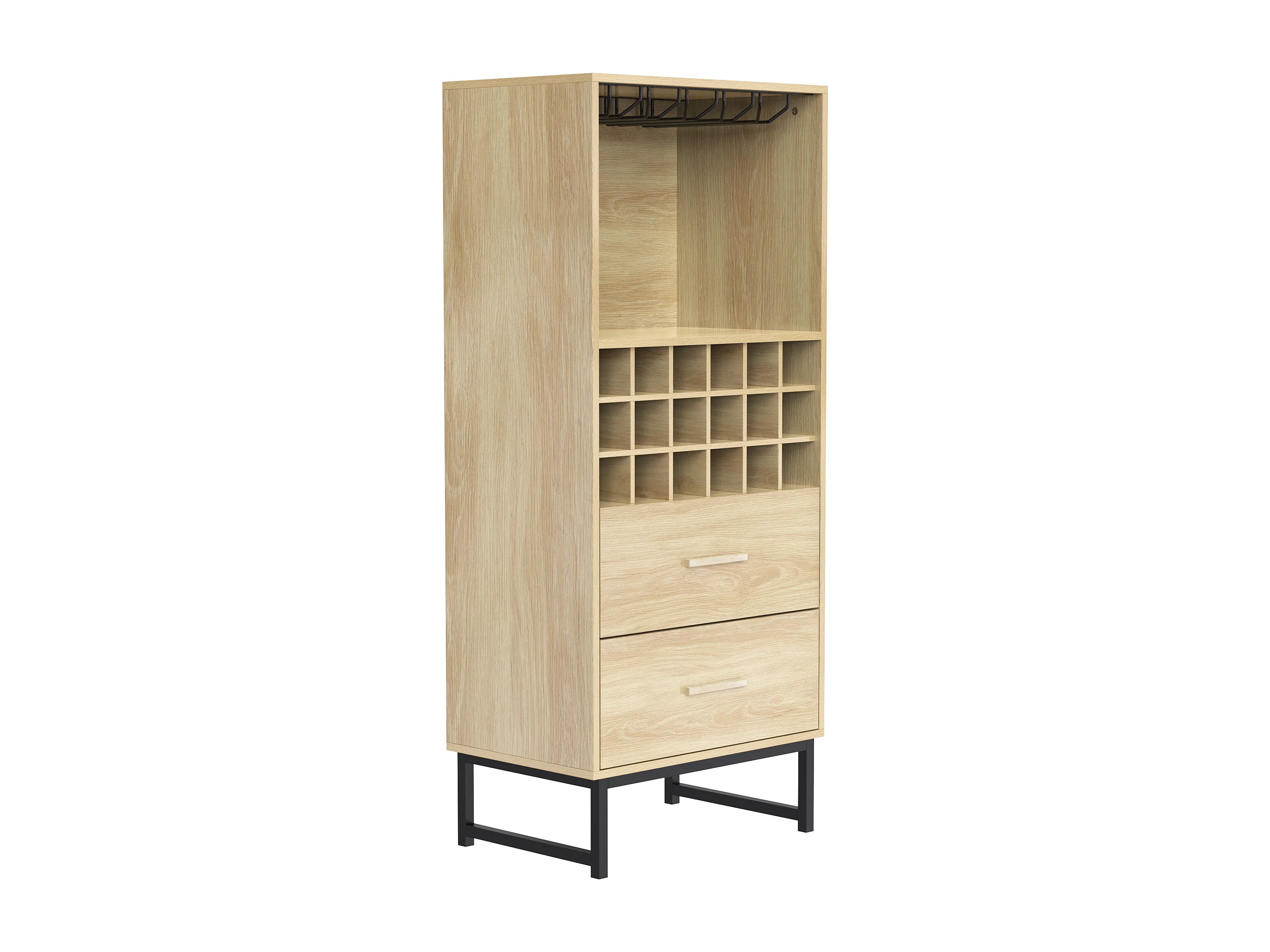 Elegante adega com 2 gavetas, 18 compartimentos, suporte para copos, pés de metal preto