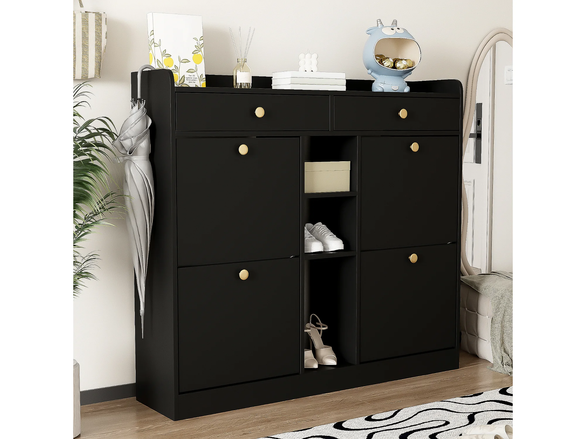 Elegante sapateira com 4 portas articuladas, 2 gavetas, 3 compartimentos abertos, preto