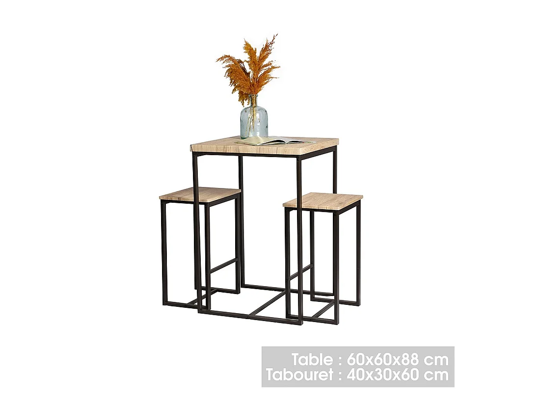 Ensemble table haute avec 2 tabourets – DARYL – Chêne et Métal Noir
