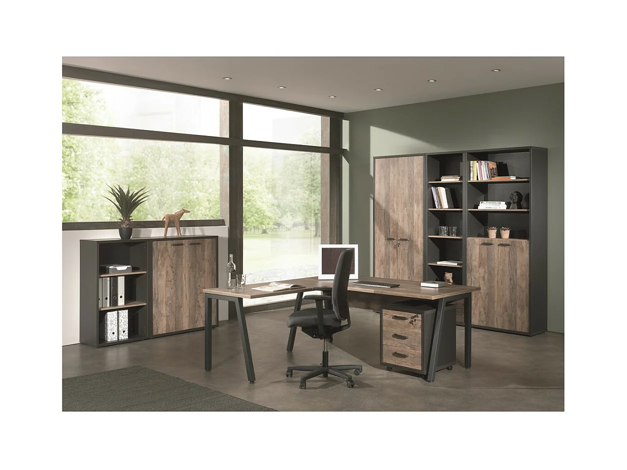 Conjunto de 8 móveis de escritório profissional em cor de carvalho envelhecido e preto da coleção SOON.