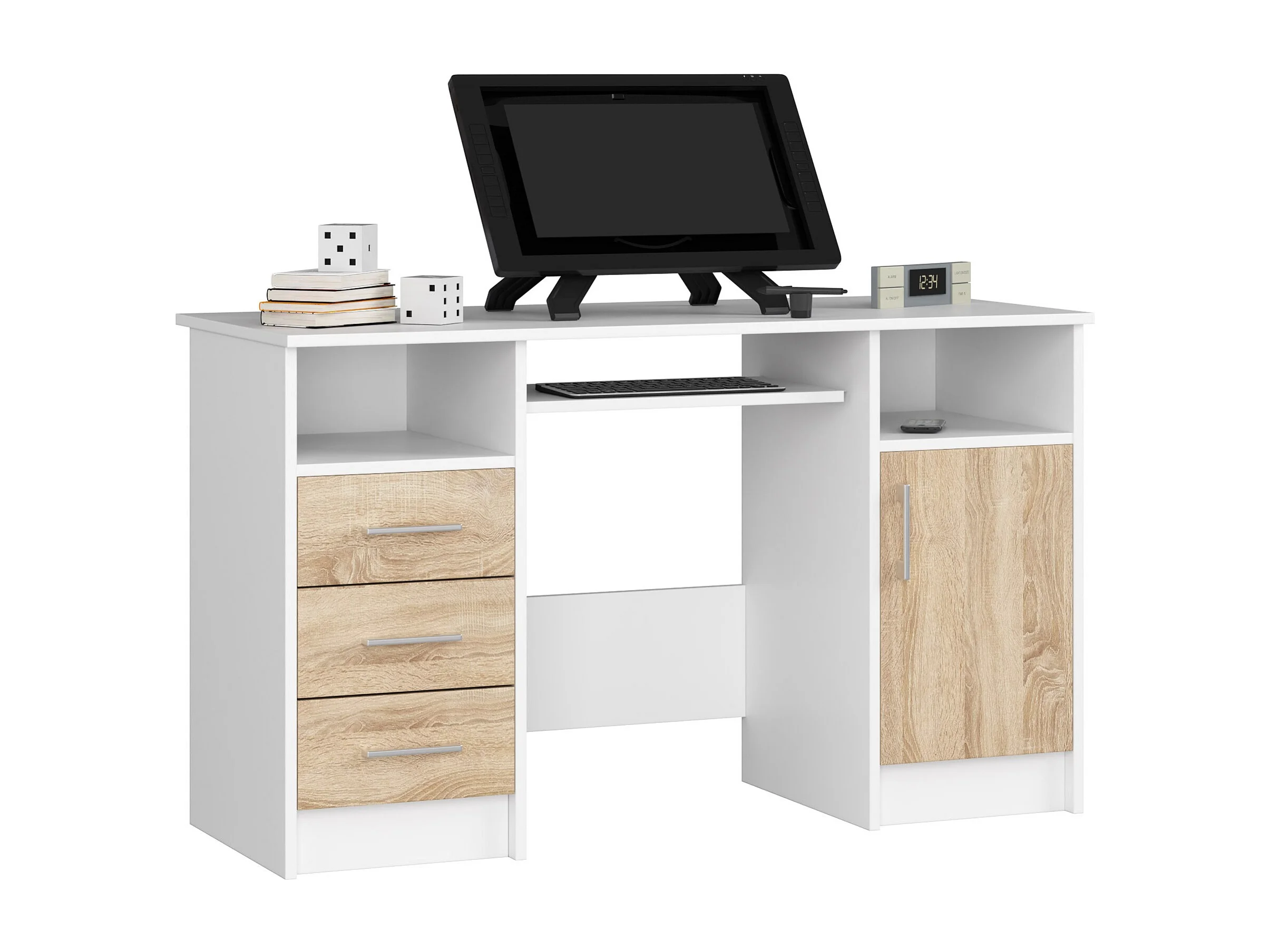 Escrivaninha Ana Bicolor, Branco/Dub Sonoma, 3 Gavetas, 1 Porta, P/B Área de Trabalho, Aut. Montagem, Materiais Laminados e ABS