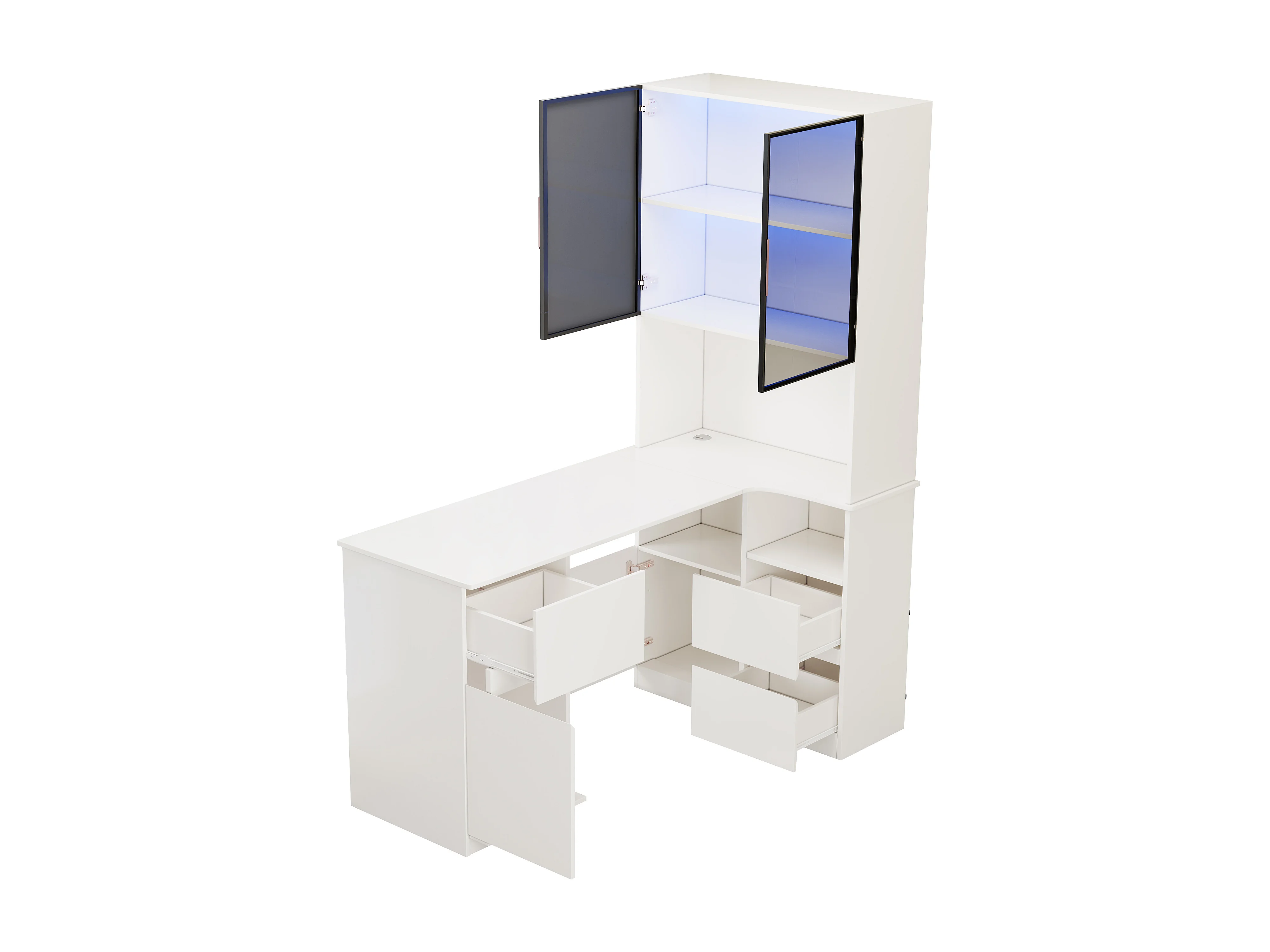 Escrivaninha de canto 120×80×180 cm - Con prateleiras e vitrine LED - 3 gavetas, 2 portas e prateleiras abertas - MDF - Branco