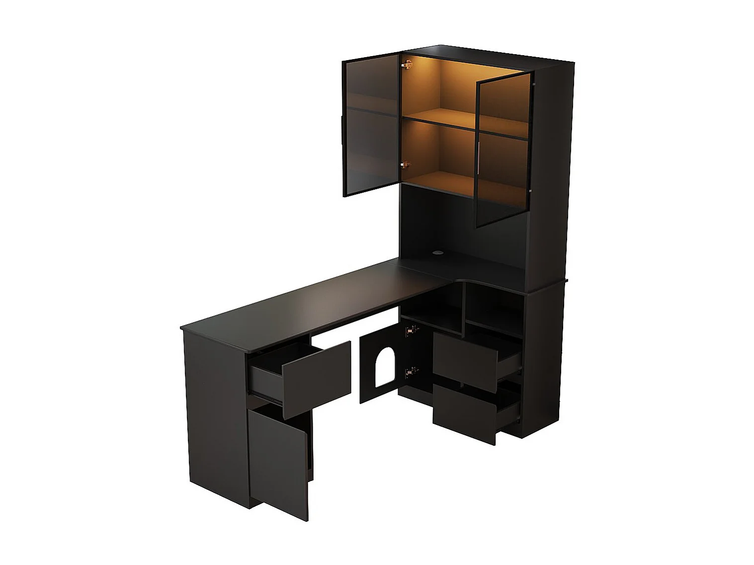 Escrivaninha de canto 120×80×180 cm - Con prateleiras e vitrine LED - 3 gavetas, 2 portas e prateleiras abertas - MDF - Preto