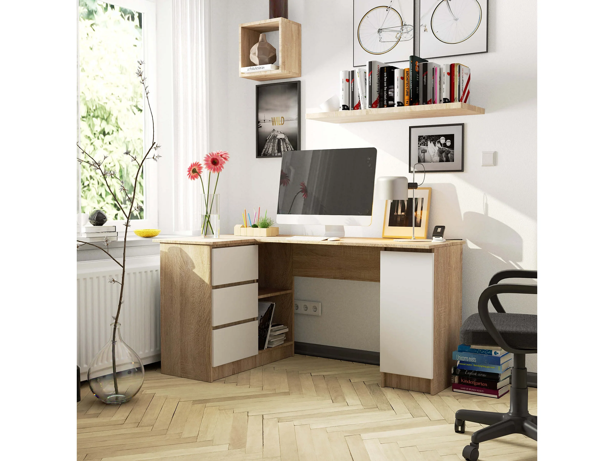 Escrivaninha de Canto Esquerdo B20 155 cm Carvalho Sonoma/Branco com Gavetas e Prateleiras