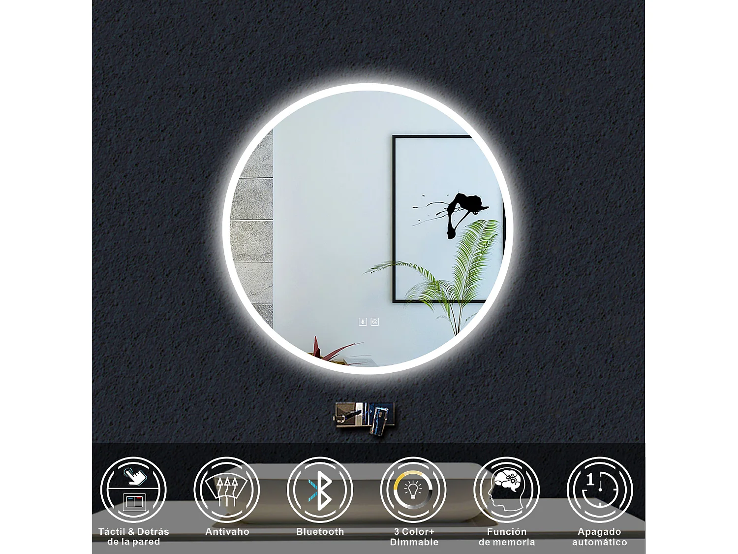 Espelho de banheiro com LED, 80 x 80 cm, luz LED com três cores, com função antiembaciamento, Bluetooth, memória de desligamento e brilho ajustável.
