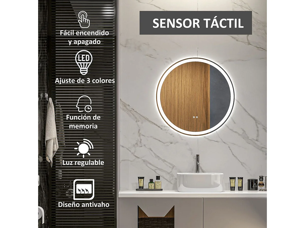 Espelho de Casa de Banho Redondo com Luz LED Ajustável e Função de Memória 60 cm