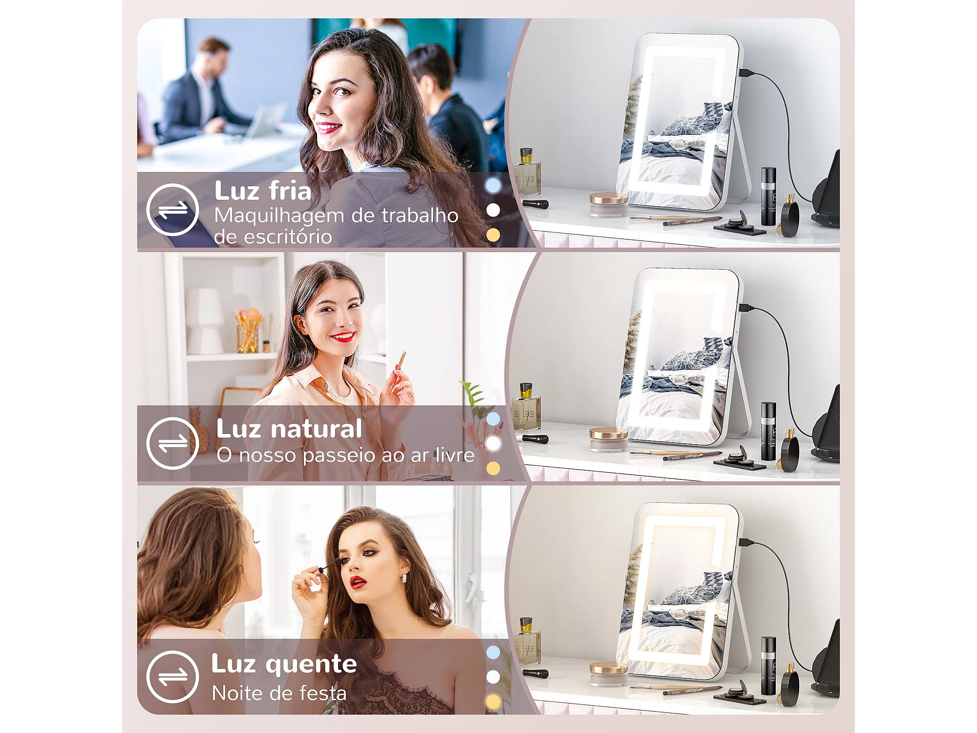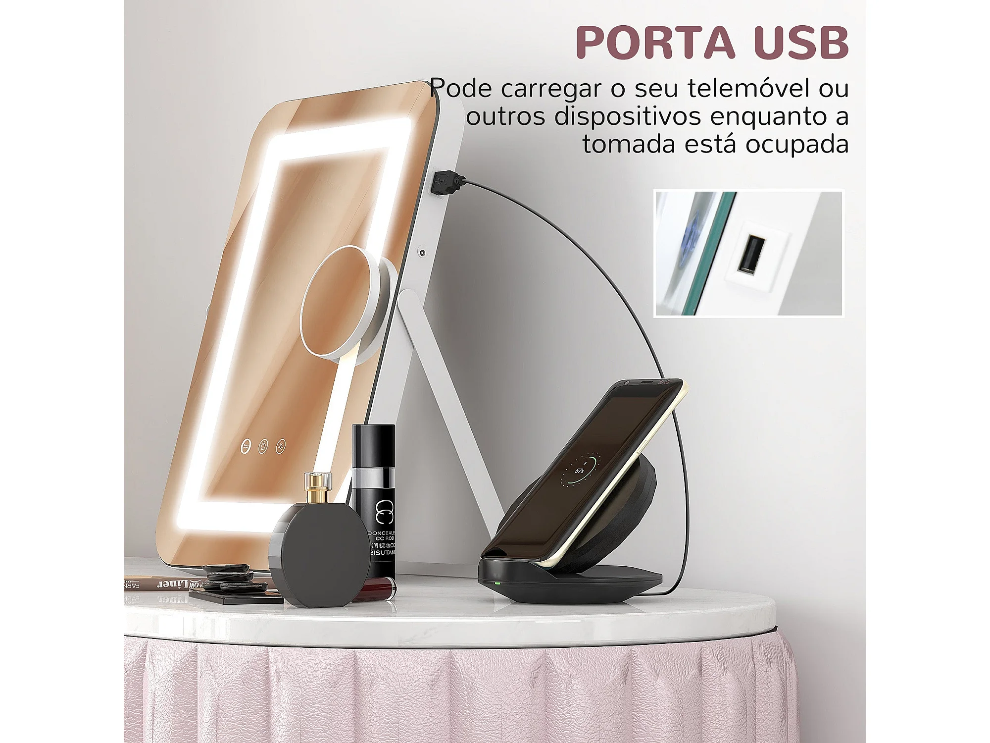 Espelho de Maquilhagem com Luz LED e Entrada USB - HOMCOM Espelho Giratório 30x40 cm com Iluminação Ajustável
