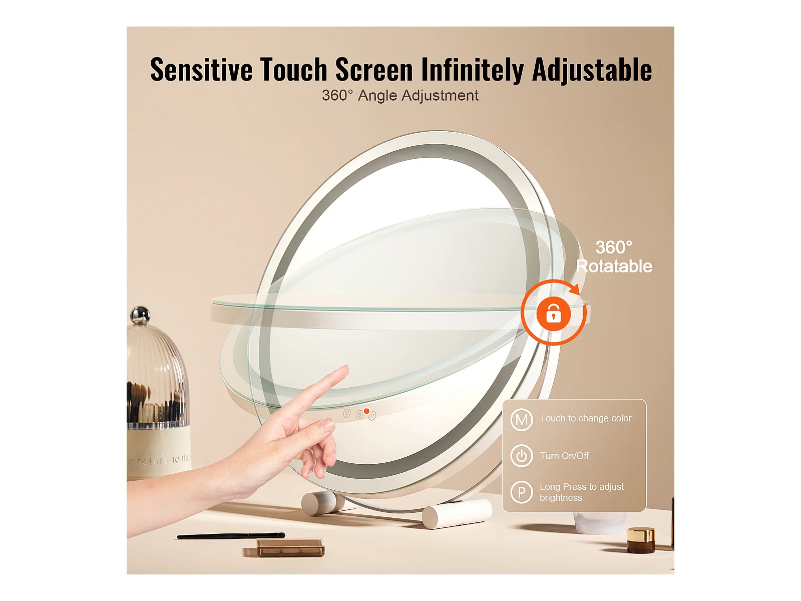 Espelho de Maquiagem Iluminado SucceBuy, Bluetooth, 3 Cores, 41 x 30 cm, 5X, Rotação a 360°, Branco, para o Maquiagem de Mesa no Quarto