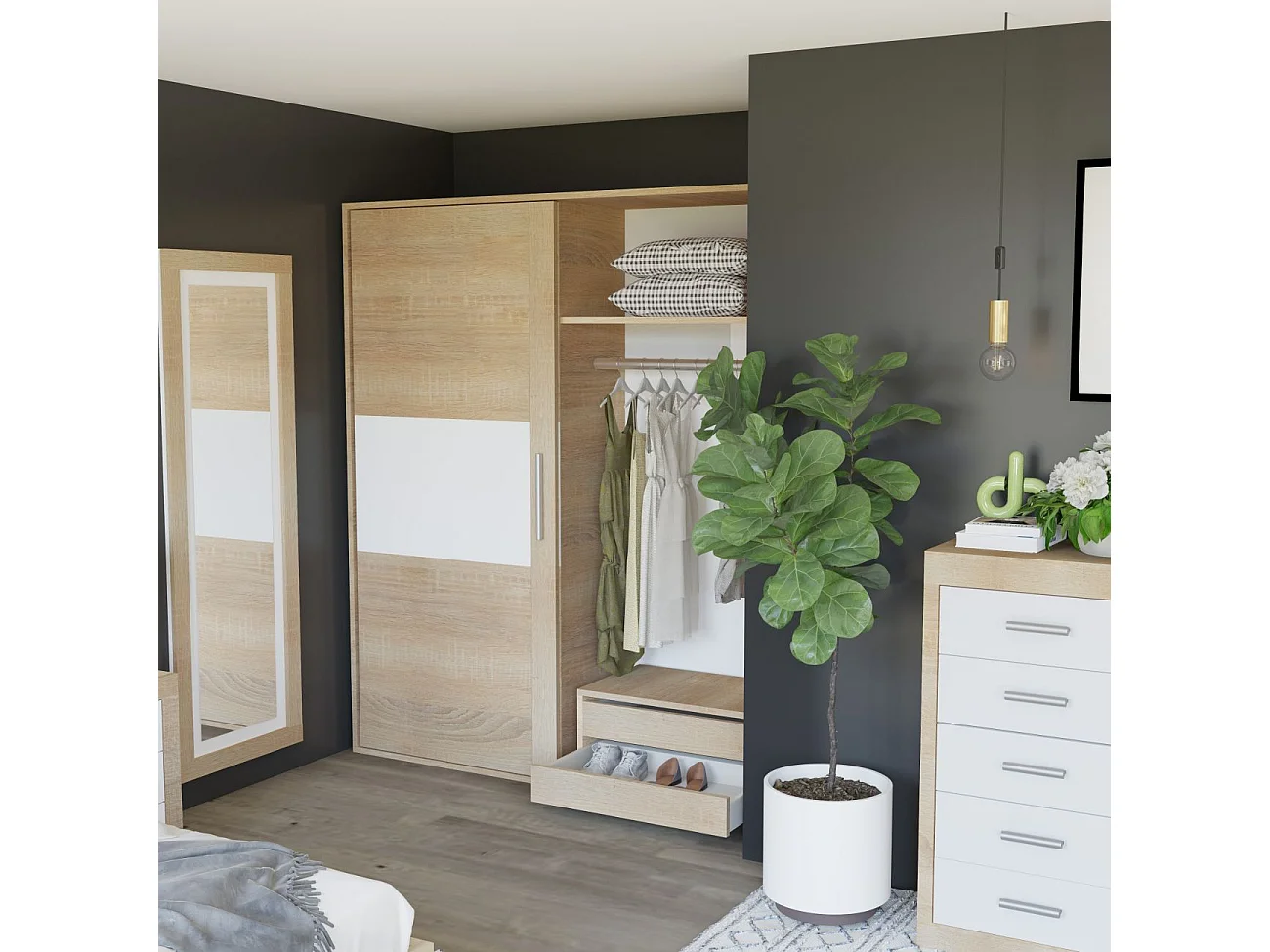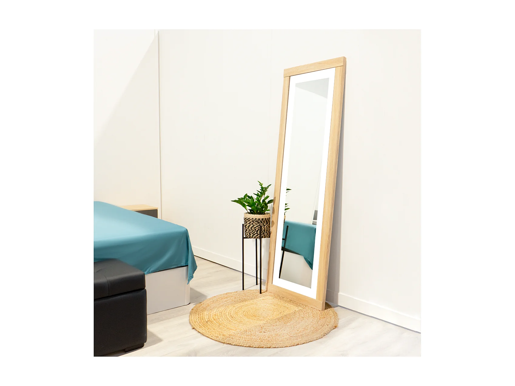 Grande espelho de design da coleção OHIO na cor carvalho claro com prateleira integrada.