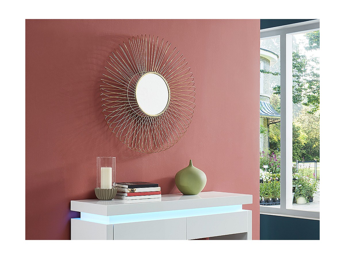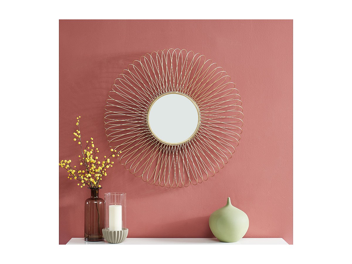 Graças à sua estrutura de arame em metal dourado, o espelho redondo DALIA representa o estilo art déco na perfeição.