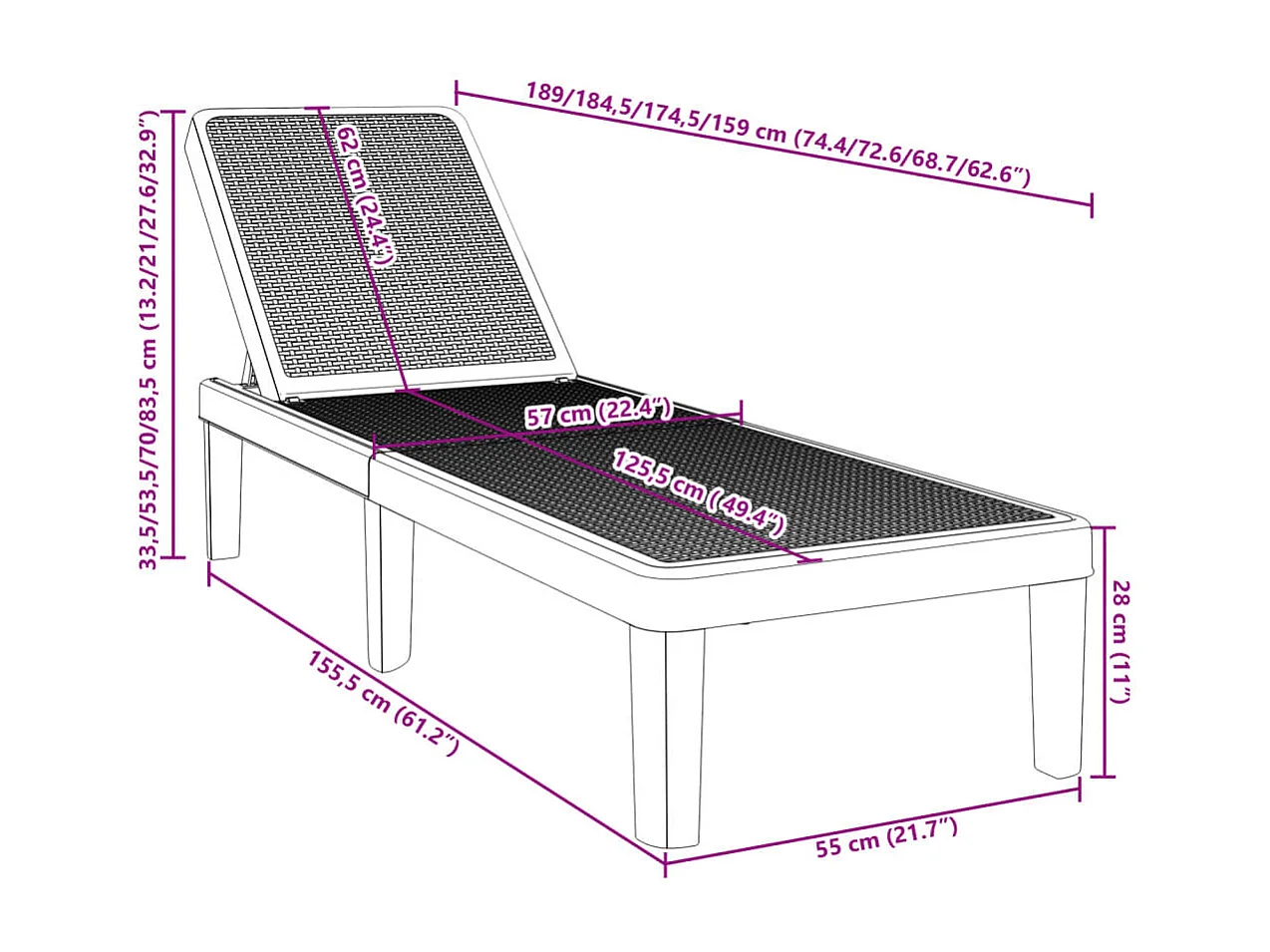 Espreguiçadeira c/ 4 ajustes de altura 155,5x57x28 cm PP
