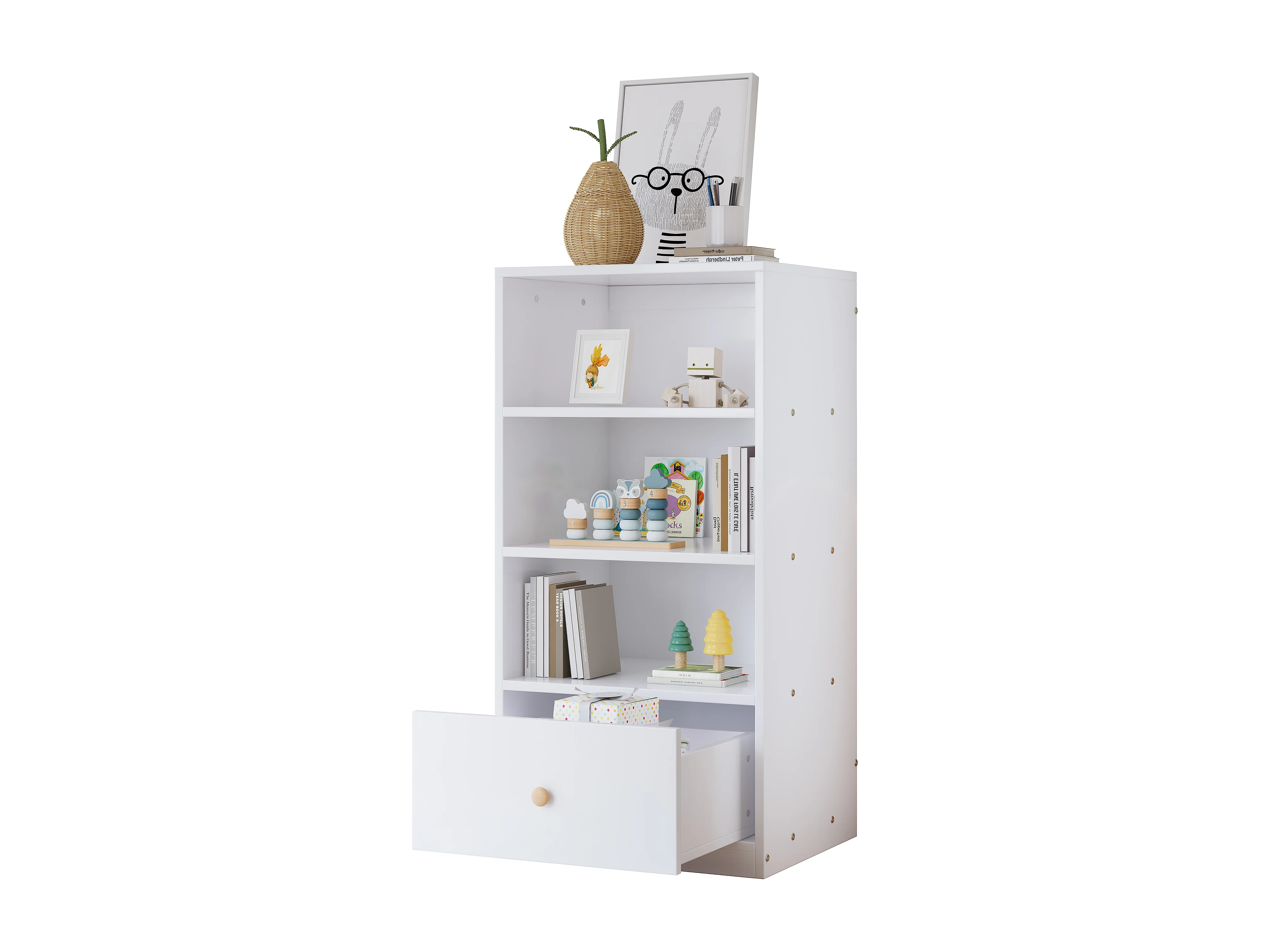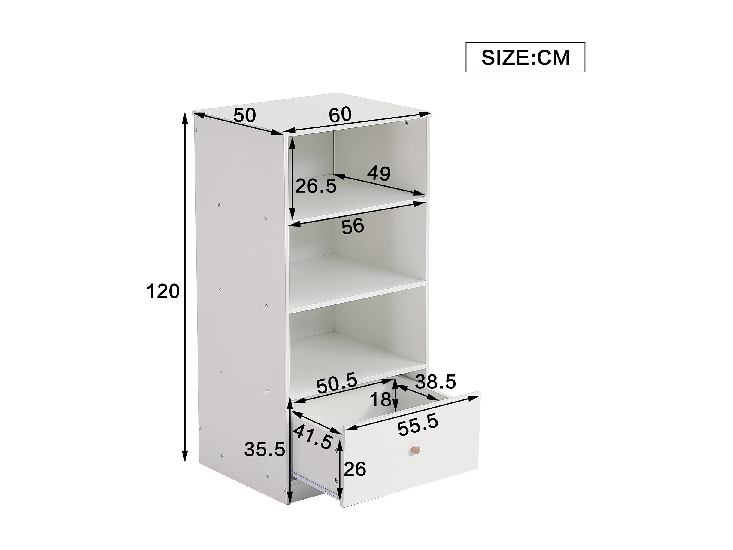 Estante 60x50x120cm, prateleira com três prateleiras e uma gaveta, corrediças silenciosas, quarto, sala, MDF, branco