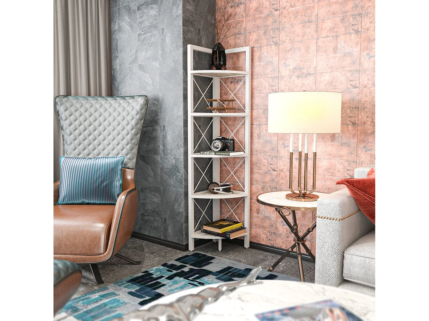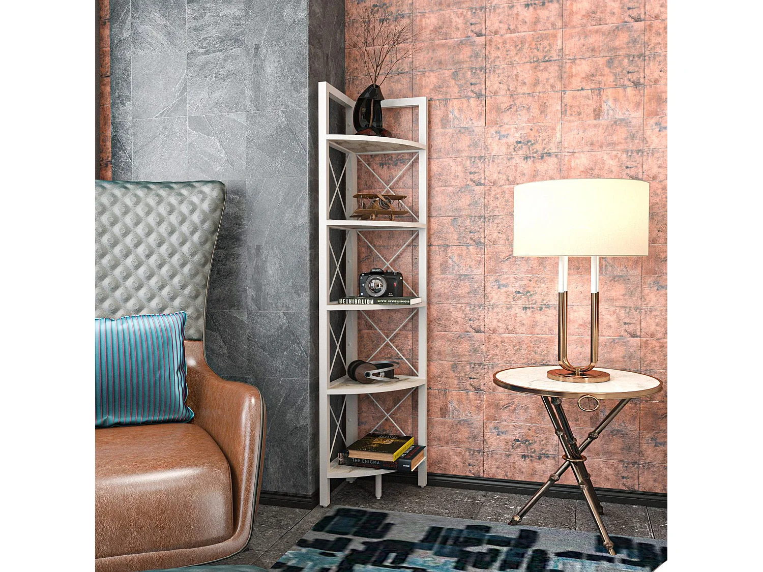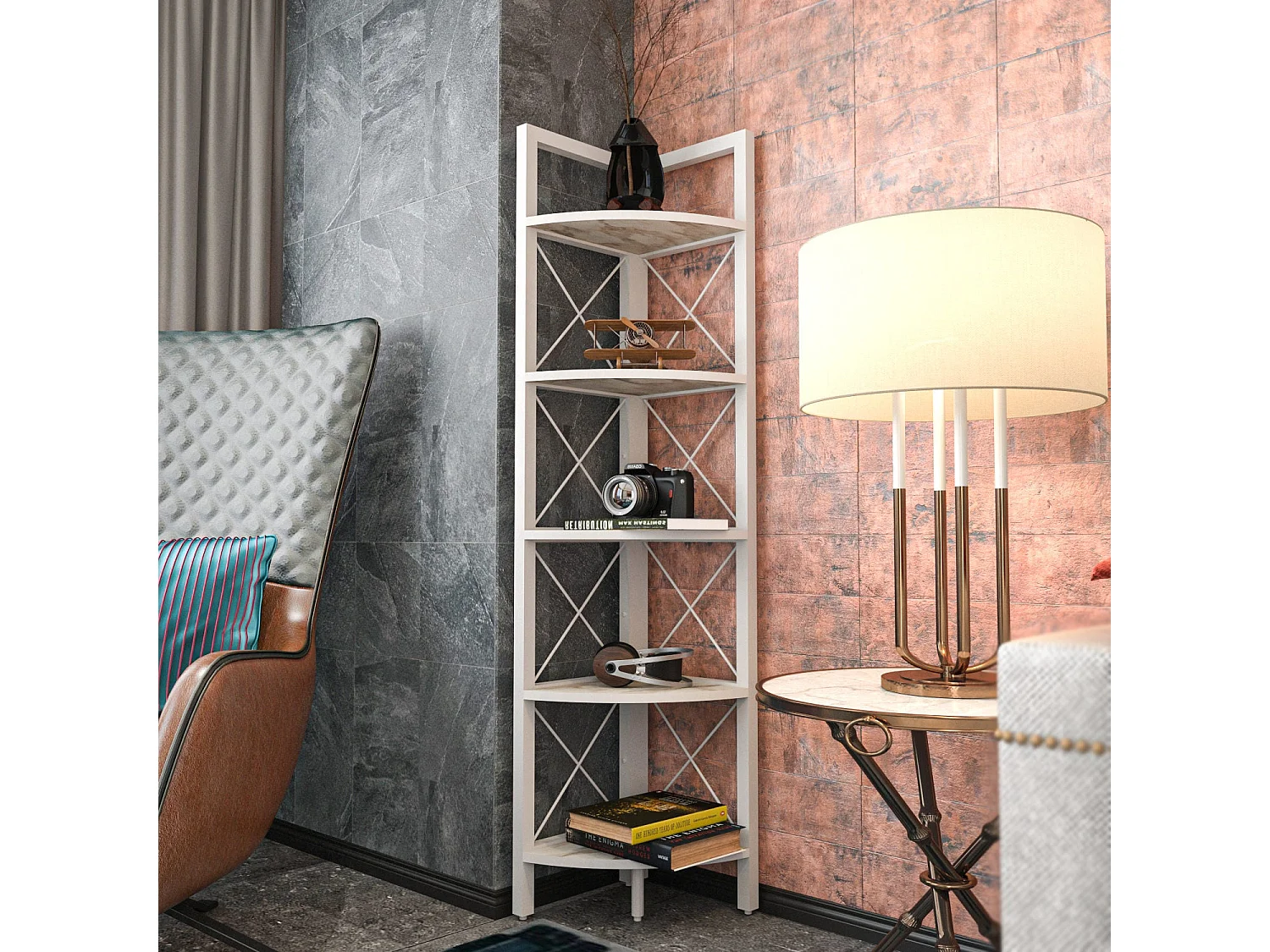 Estante de livros – 170 x 175 x 30 cm – Mármore branco e dourado – Metal