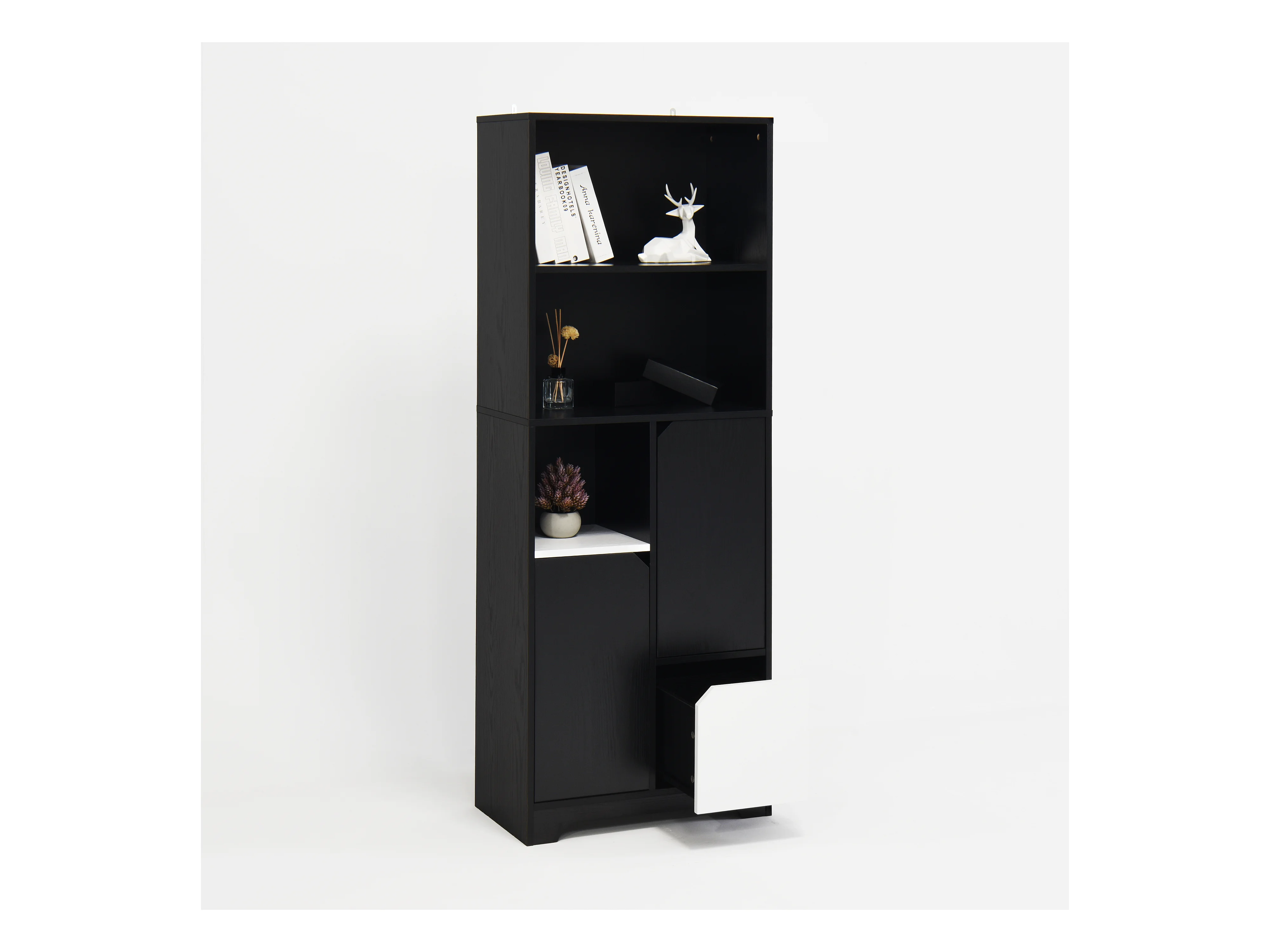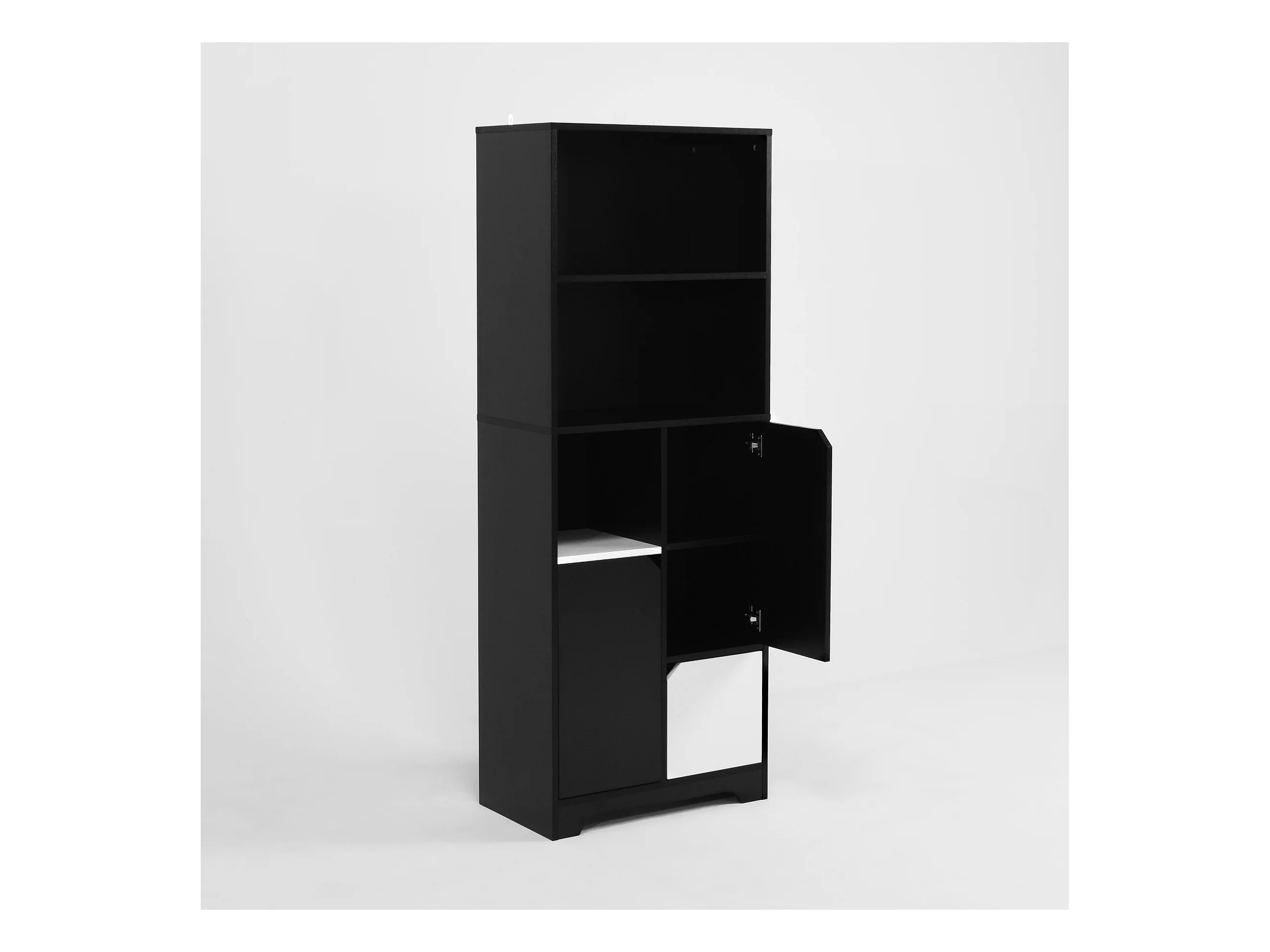 Estante alta em MDF preto com 4 portas de vidro e prateleiras ajustáveis, sala de estar e quarto