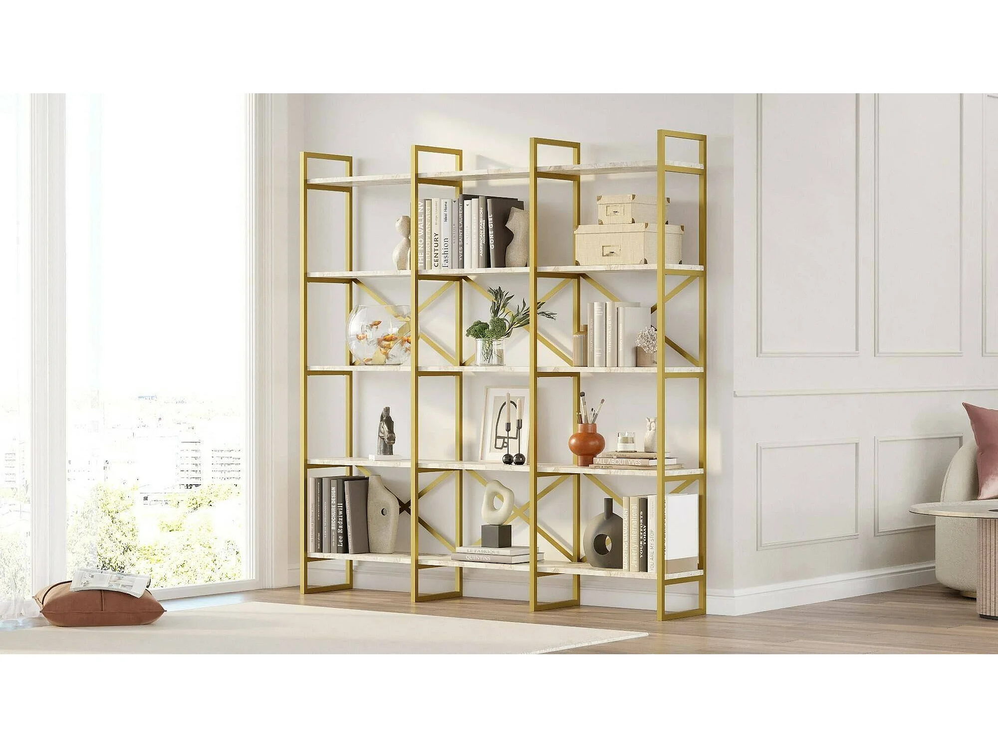 Estante Dpezzott, Estante de escritório, Estante de livros, Biblioteca, 170x30h175 cm, Branco e Dourado