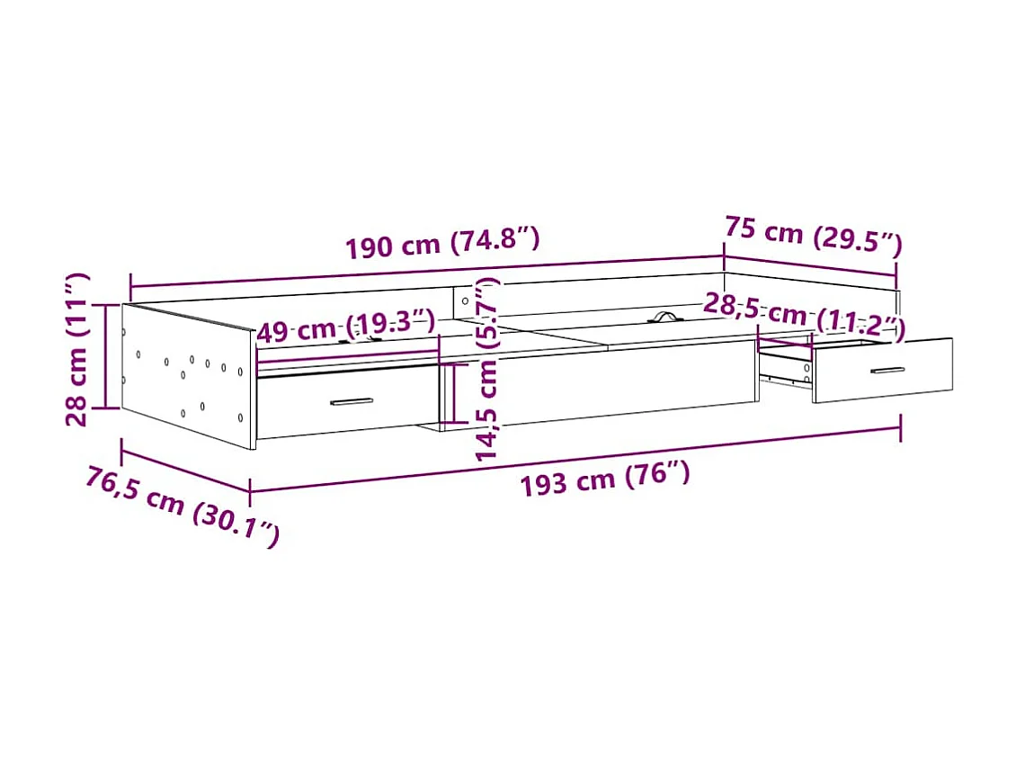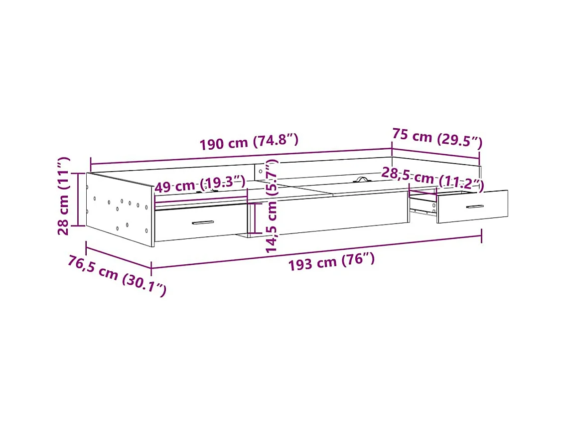 Estrutura de Divã com Gavetas Carvalho preto 75 x 190 cm