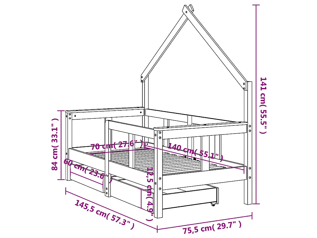 Estrutura cama infantil c/ gavetas 70x140cm pinho maciço branco