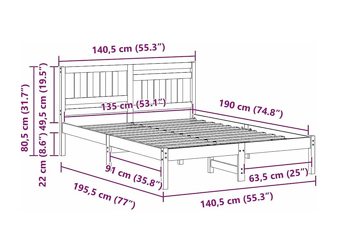 Estrutura cama c/ cabeceira 135x190 cm pinho maciço branco