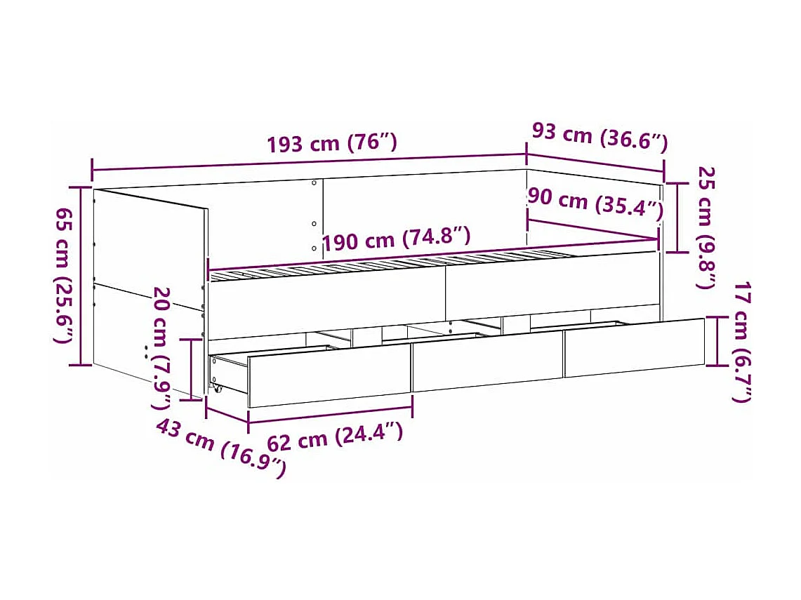 Estrutura de Divã com Gavetas Carvalho preto 90 x 190 cm