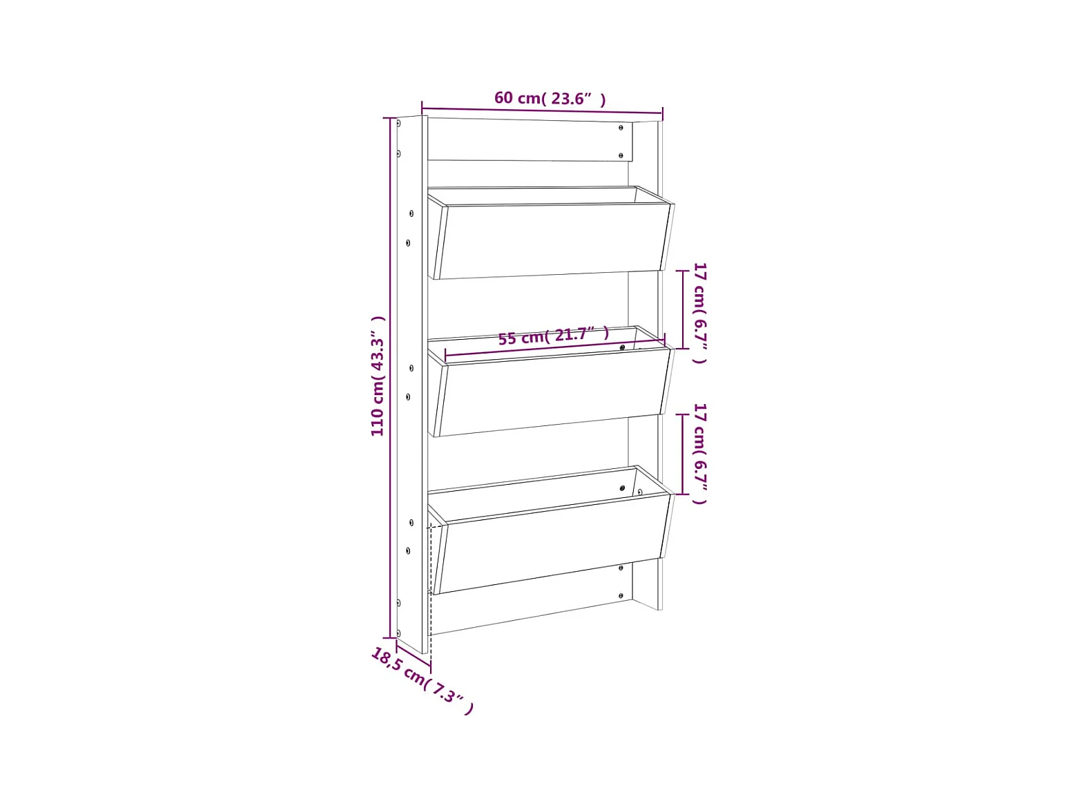 Floreira parede c/ 3 caixas 60x18,5x110cm pinho maciço preto