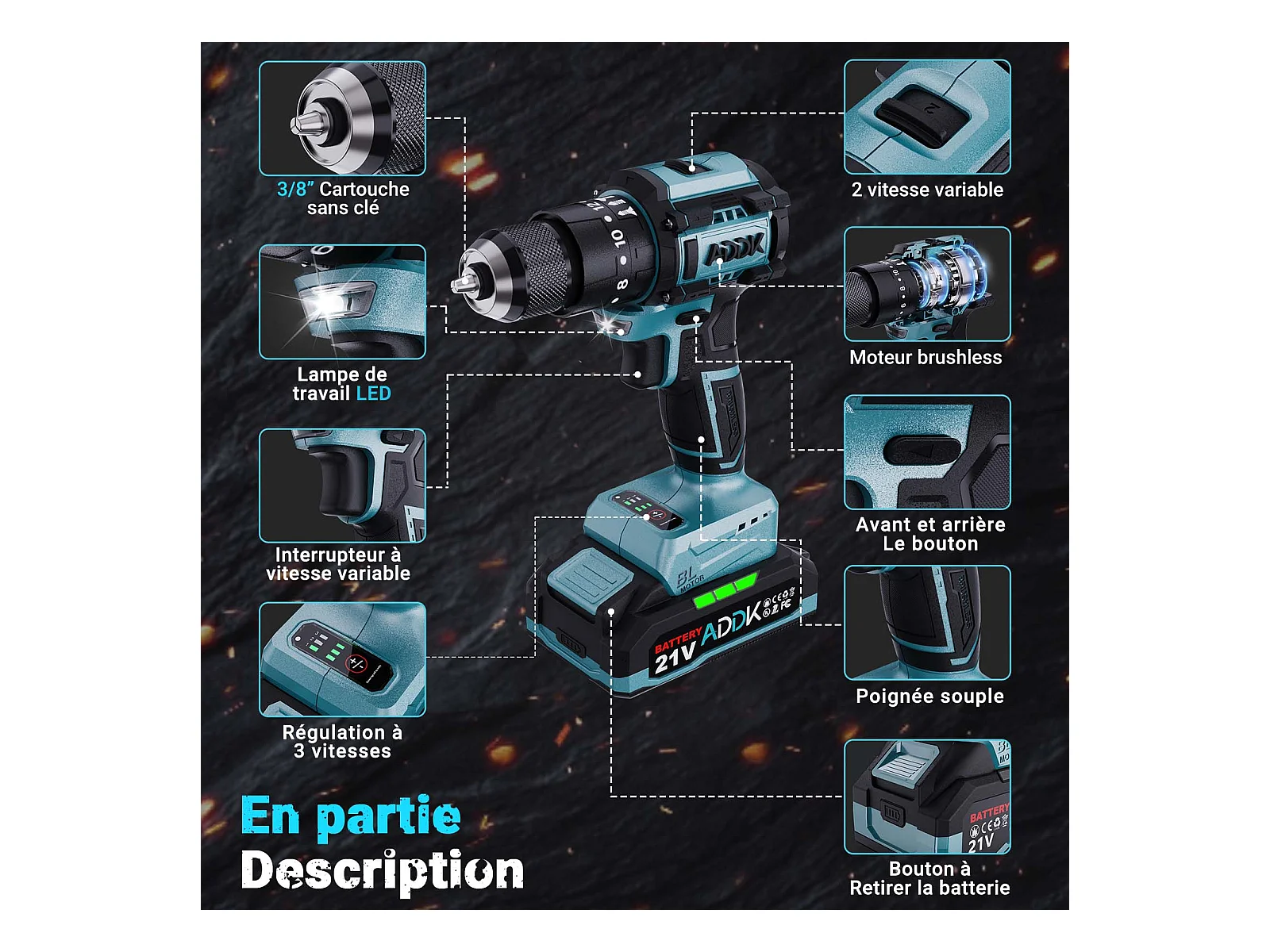 Furadeira com bateria de lítio de 21 V, 24 + 3 funções de percussão, 3 configurações de velocidade, conjunto de 22 peças, azul