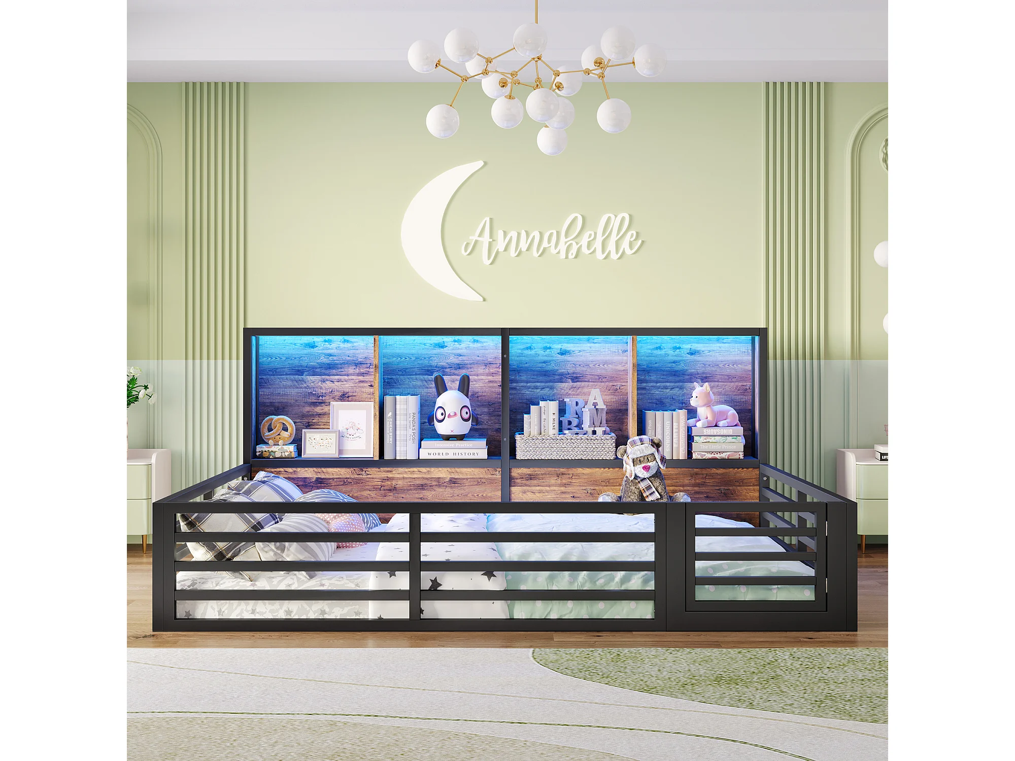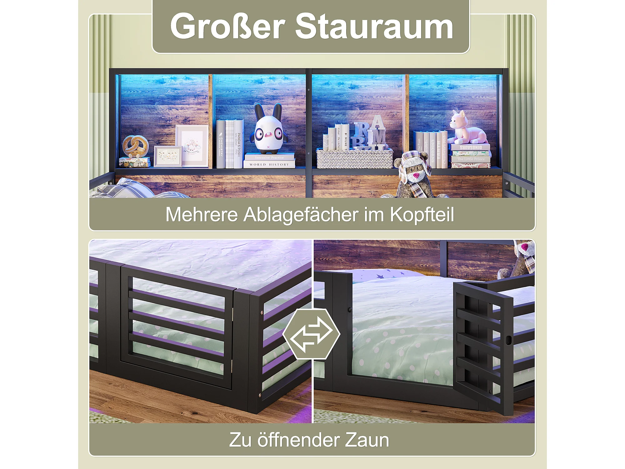 Cama infantil com grade de proteção - 140 x 200 cm - mesa de cabeceira com arrumação - com base ripada - MDF + metal - preta