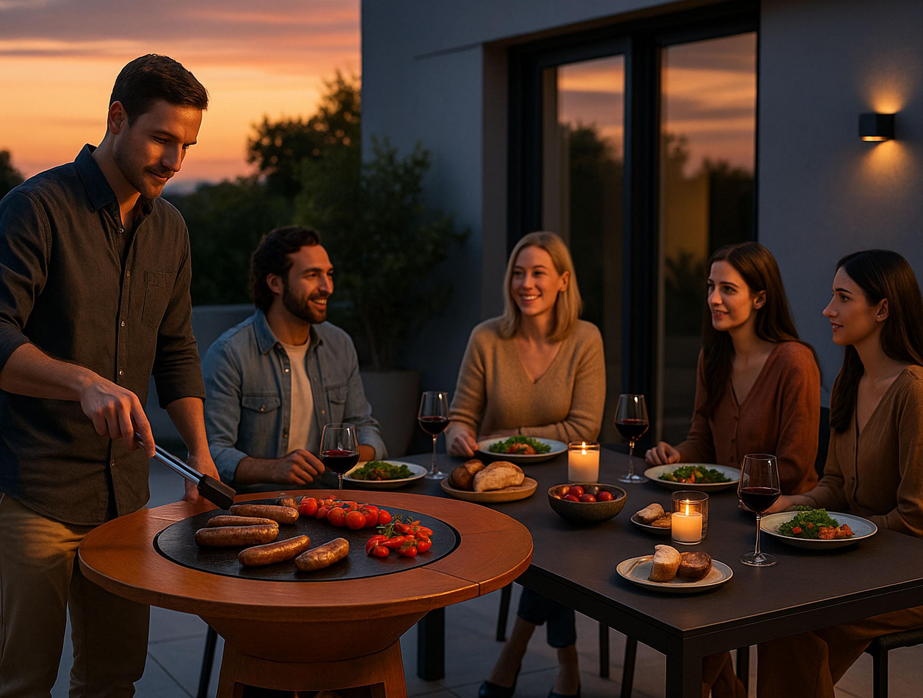 Grelhador redondo com grelha e placa de grelhar em aço e tábua de madeira