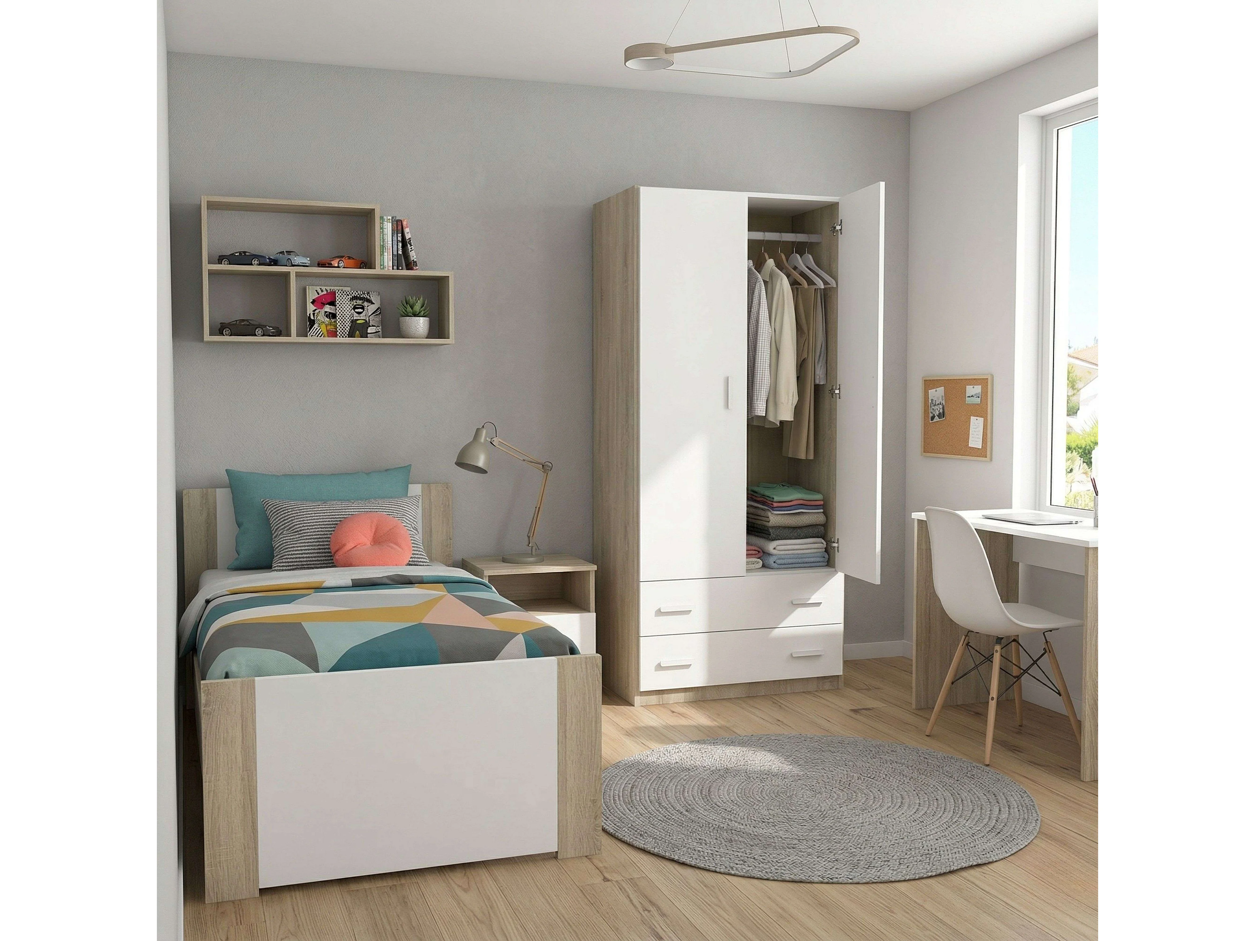 Guarda-roupa com 2 portas, 2 gavetas, carvalho Cambriano, branco fosco, varão para pendurar roupas, 180x74x50 cm