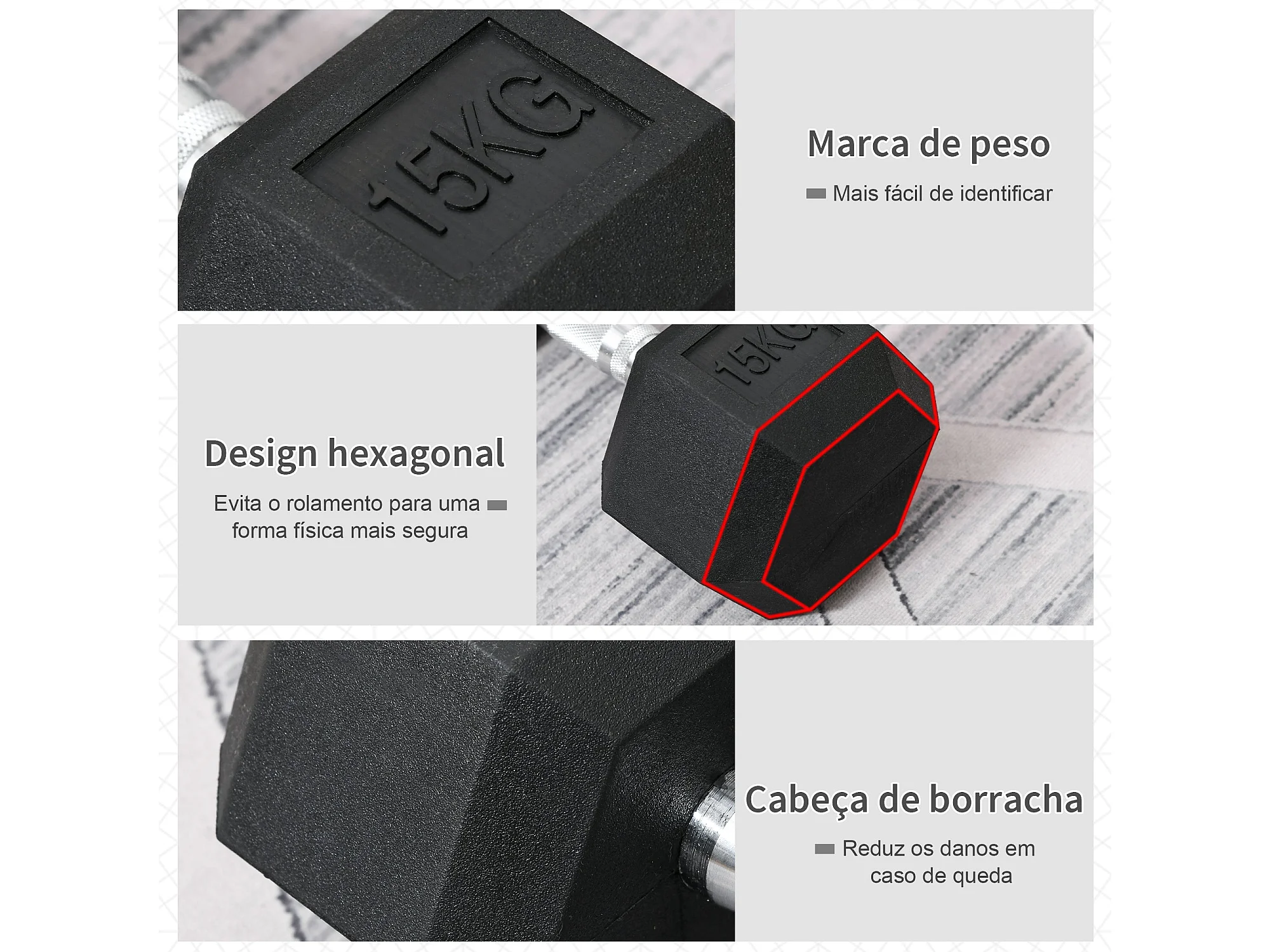 Haltere Hexagonal de 15 kg com Barra de Conexão Metálica para Treinos em Casa ou Escritório - Modelo Chamonix Preto e Prata