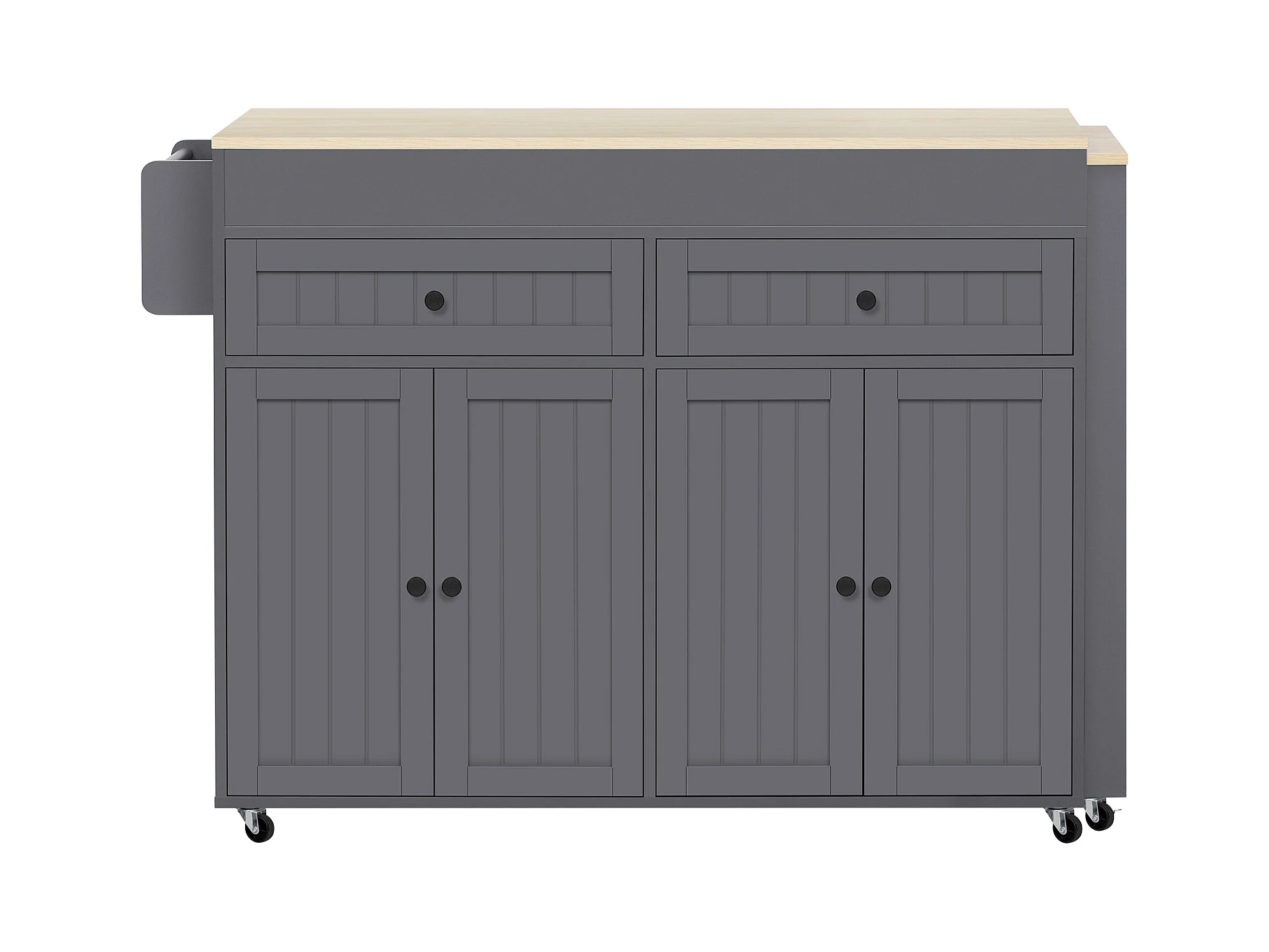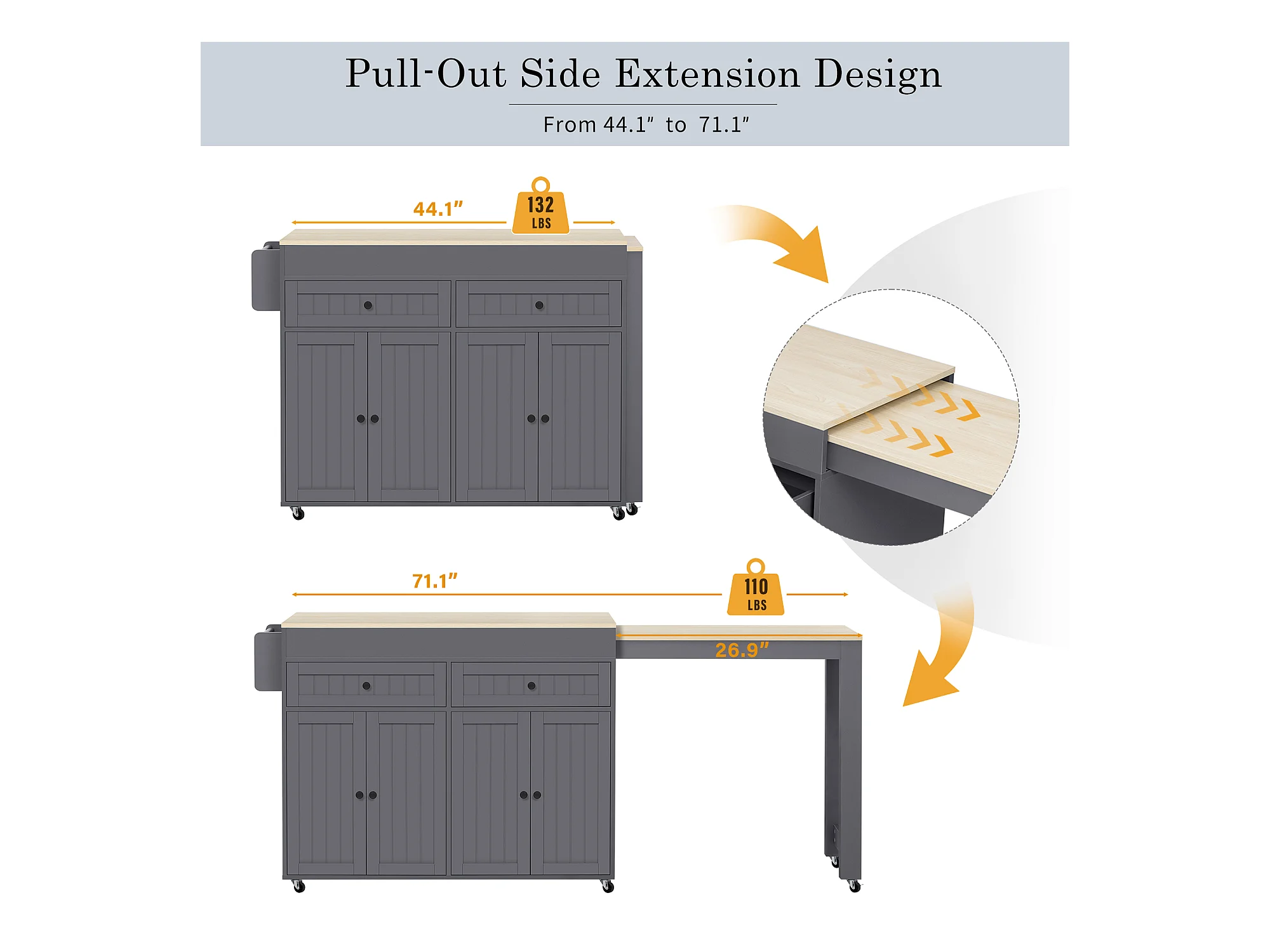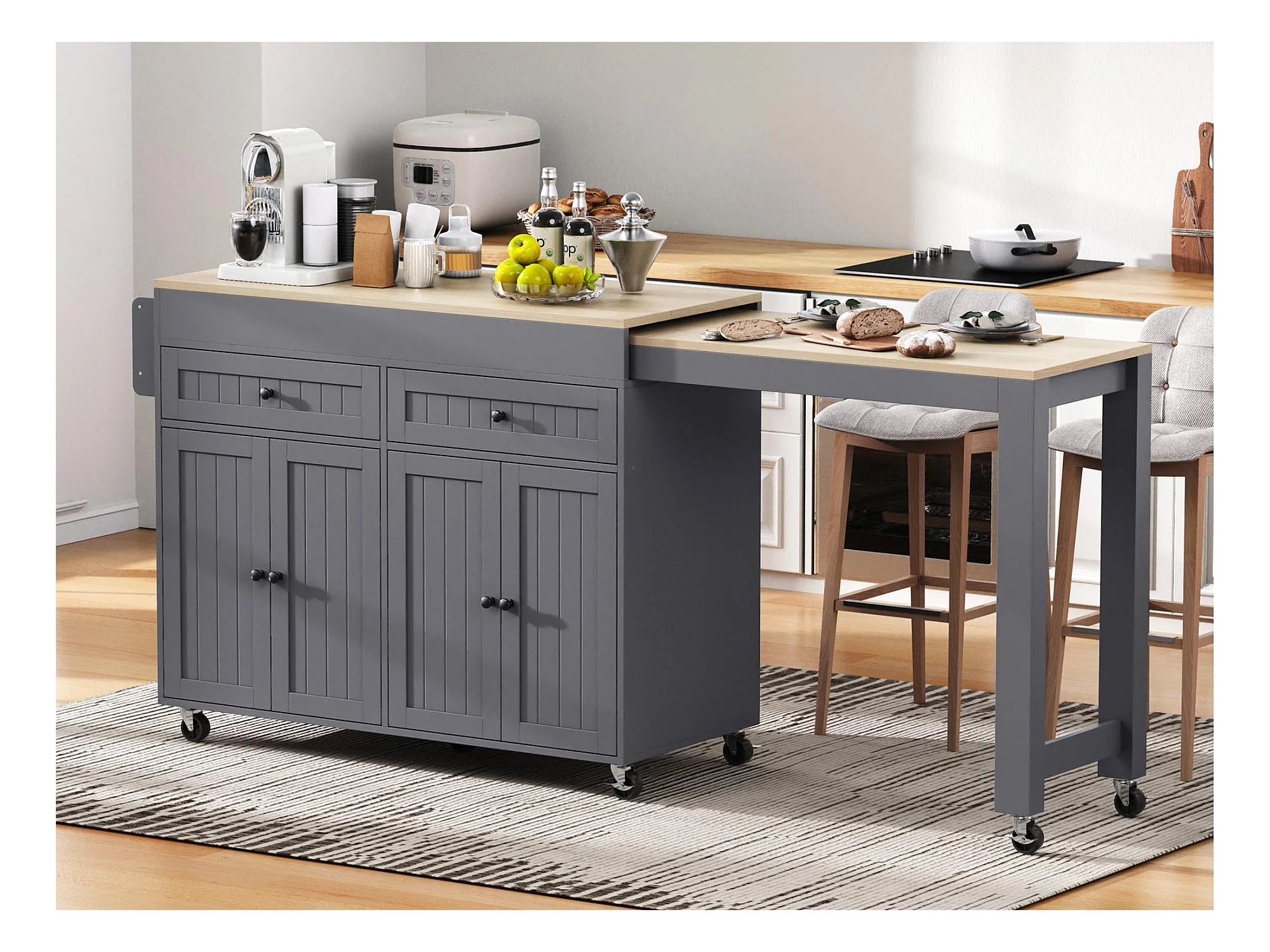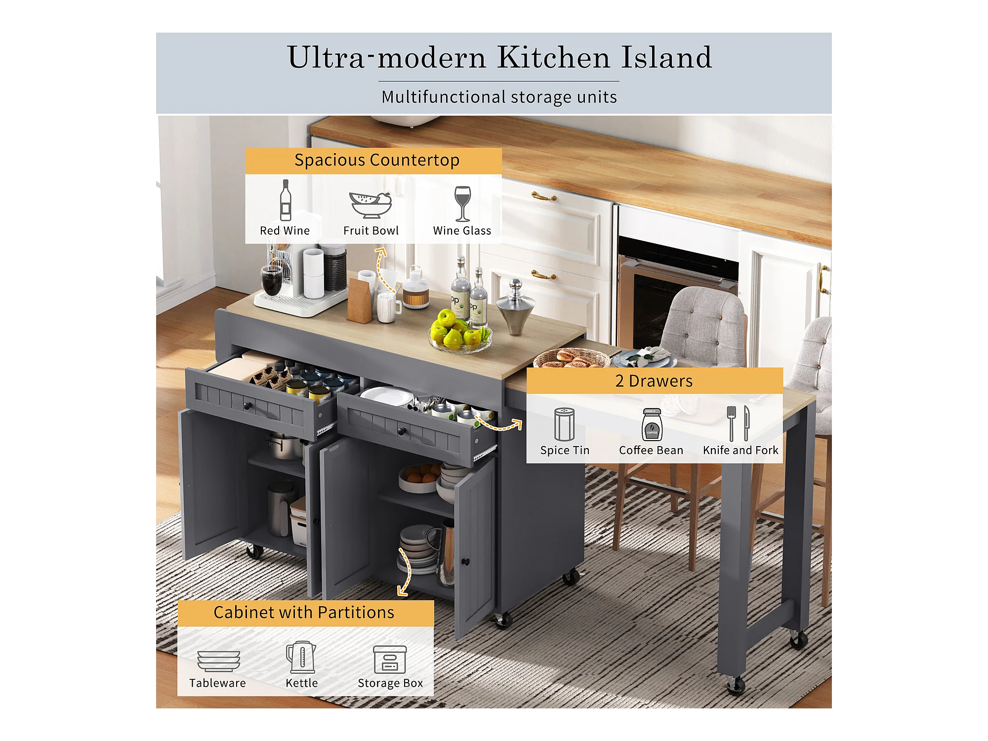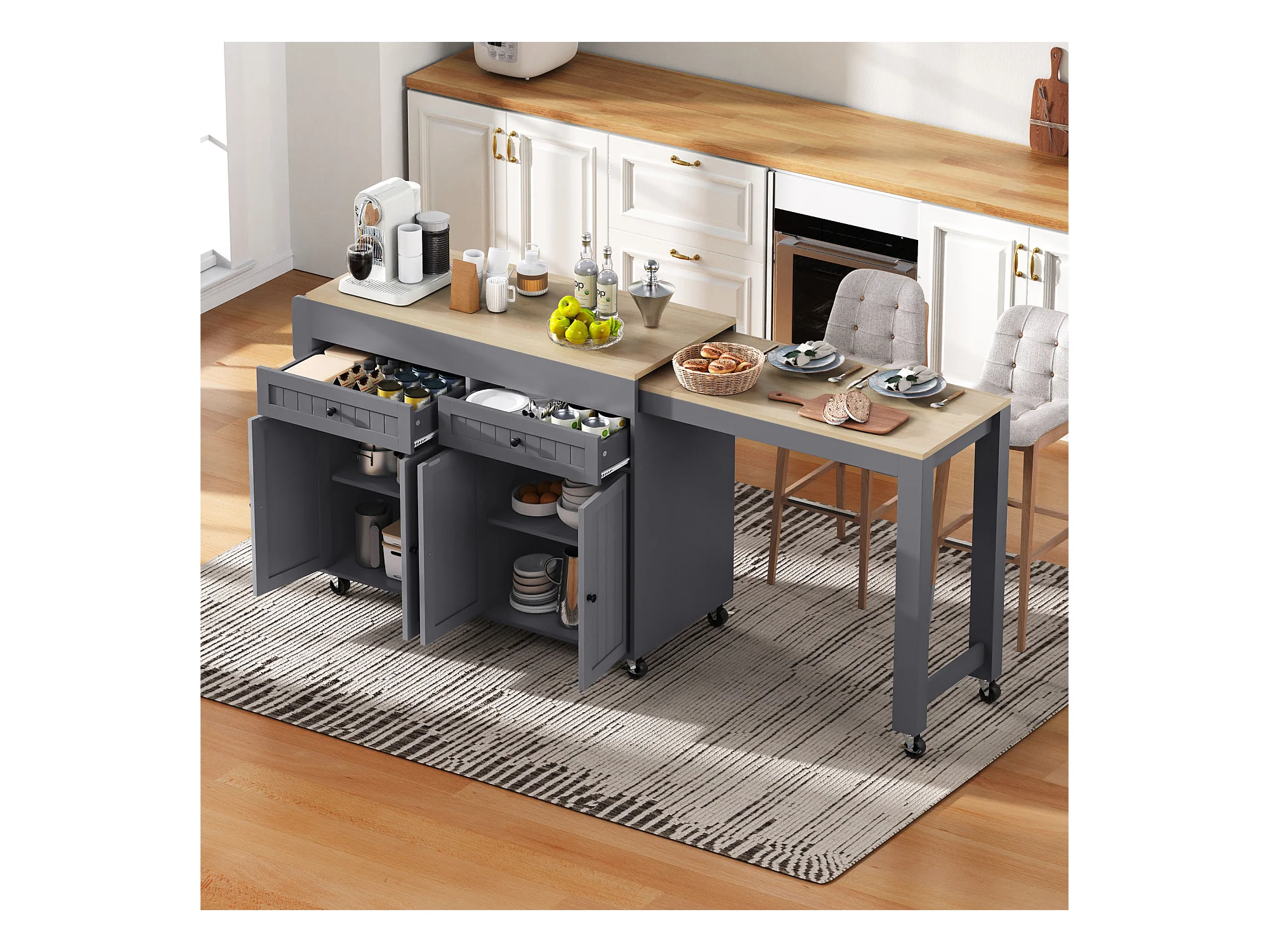 Ilha de cozinha central - com 4 portas e 2 gavetas - bancada extensível - com rodízios - 180,5×45×92,2 cm - Cinza