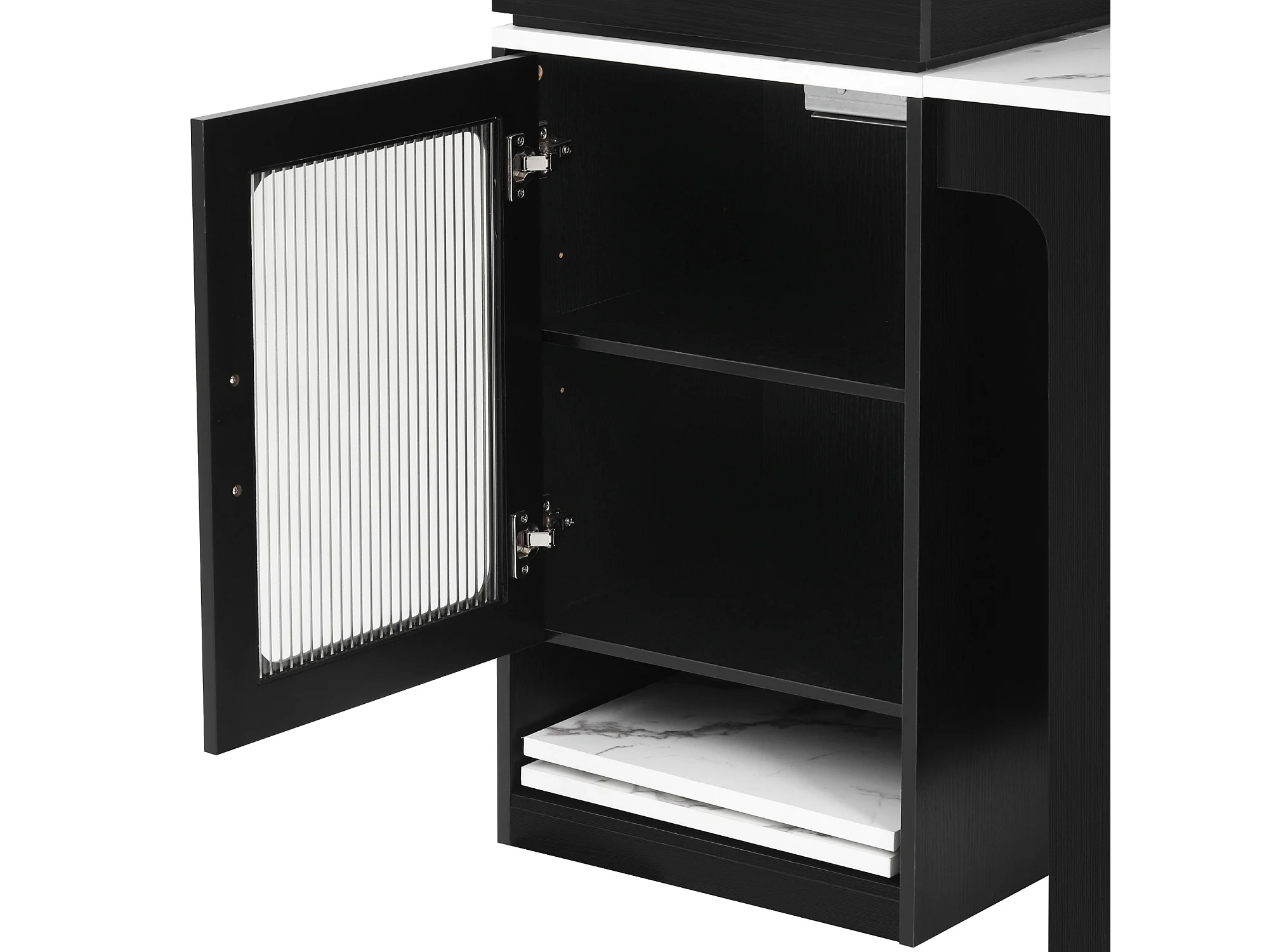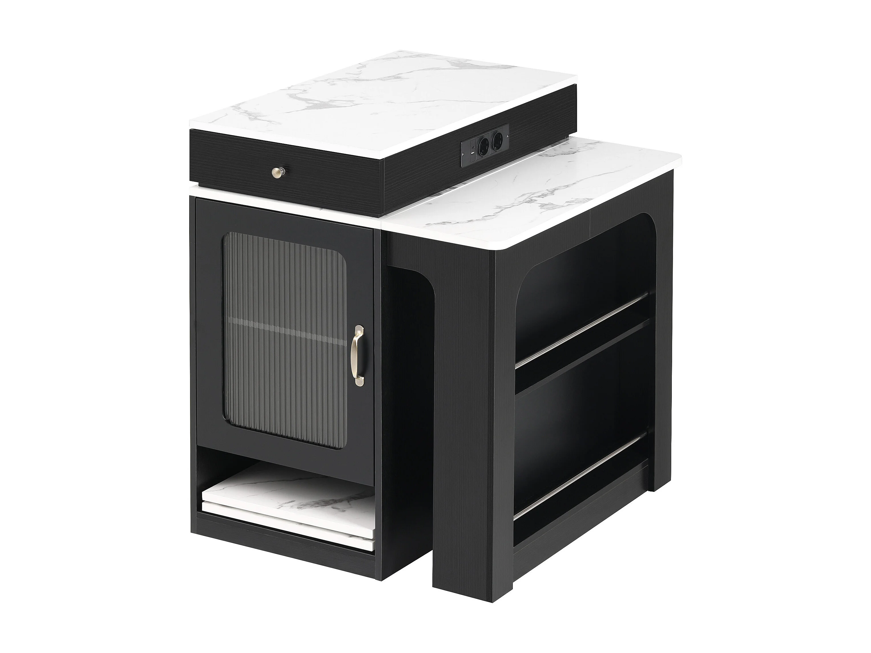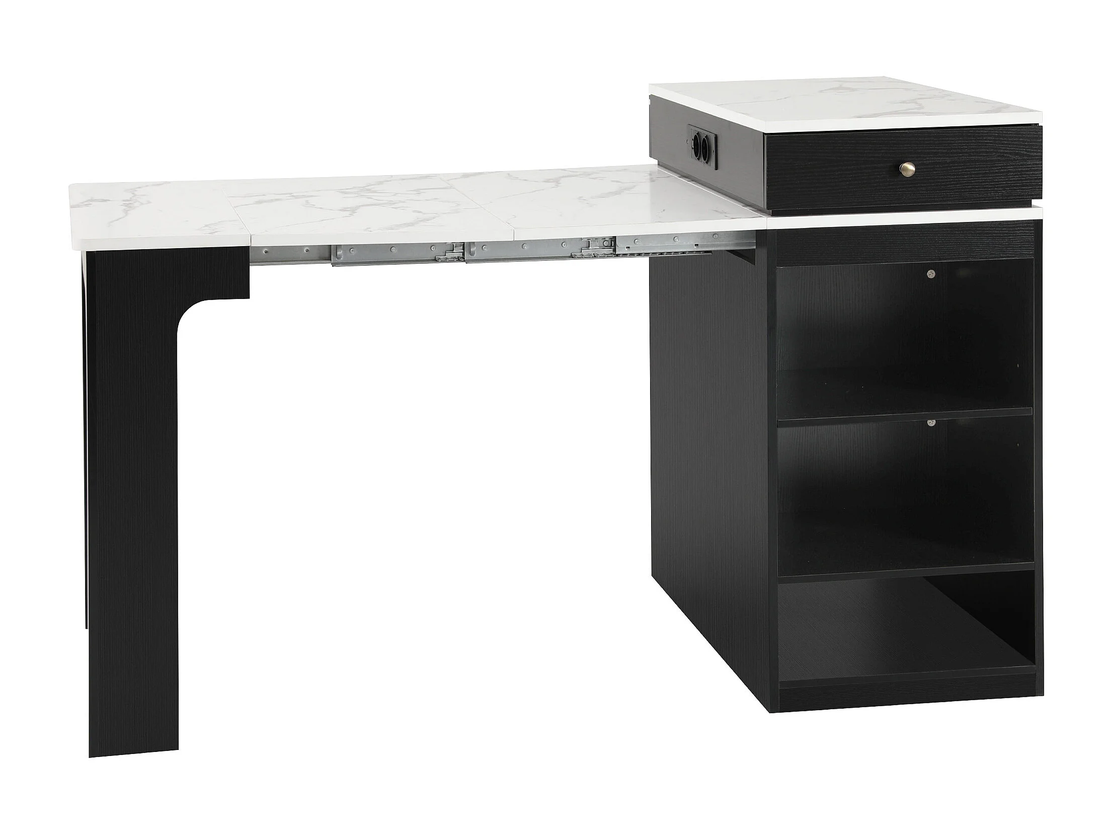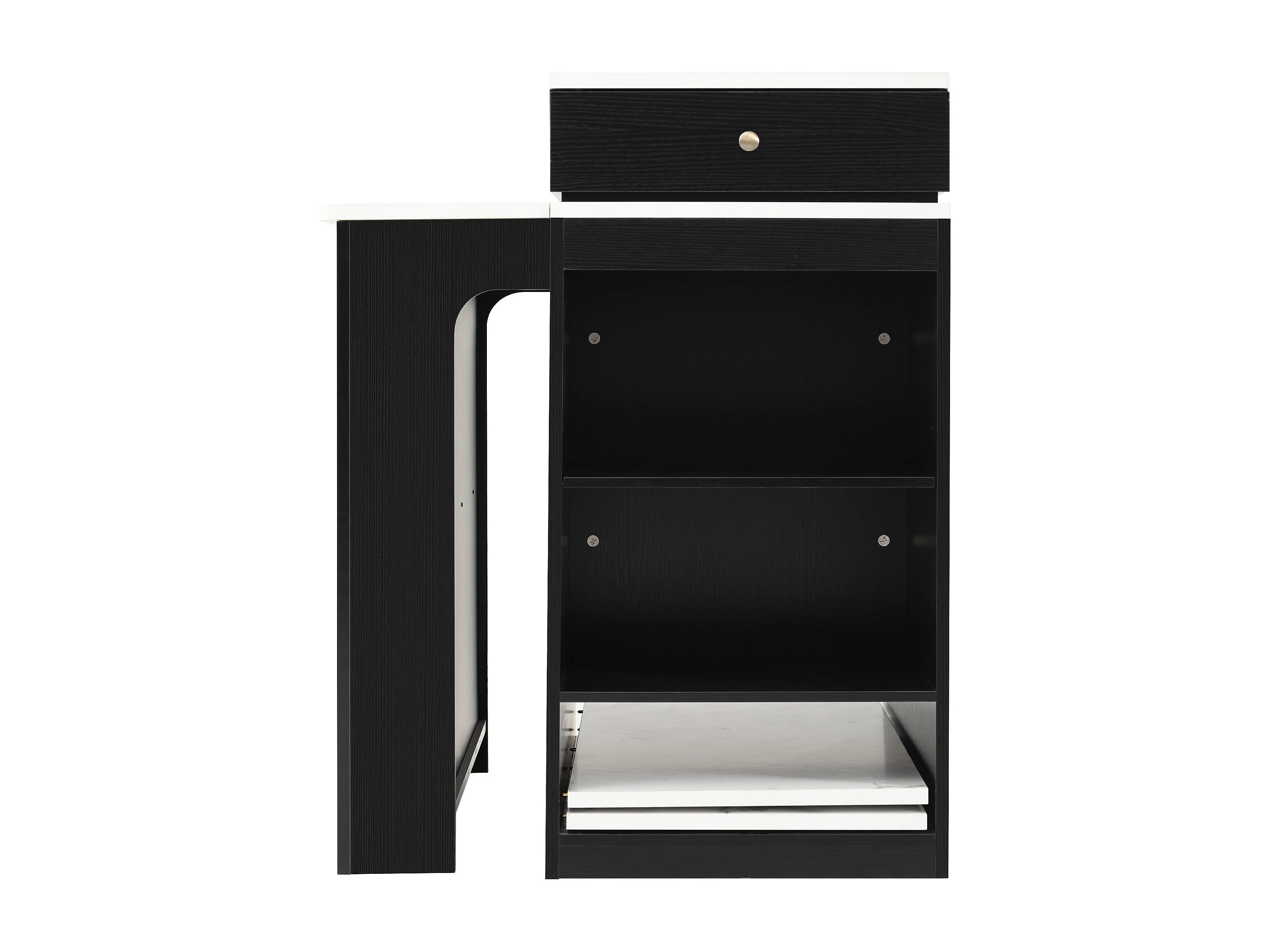 Ilha de cozinha com rodízios, tomadas, porta e duas gavetas - mesa extensível - Branco e preto
