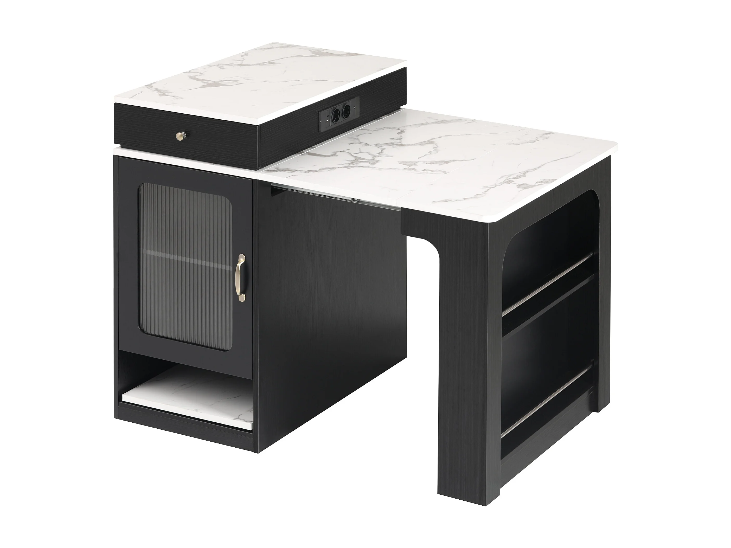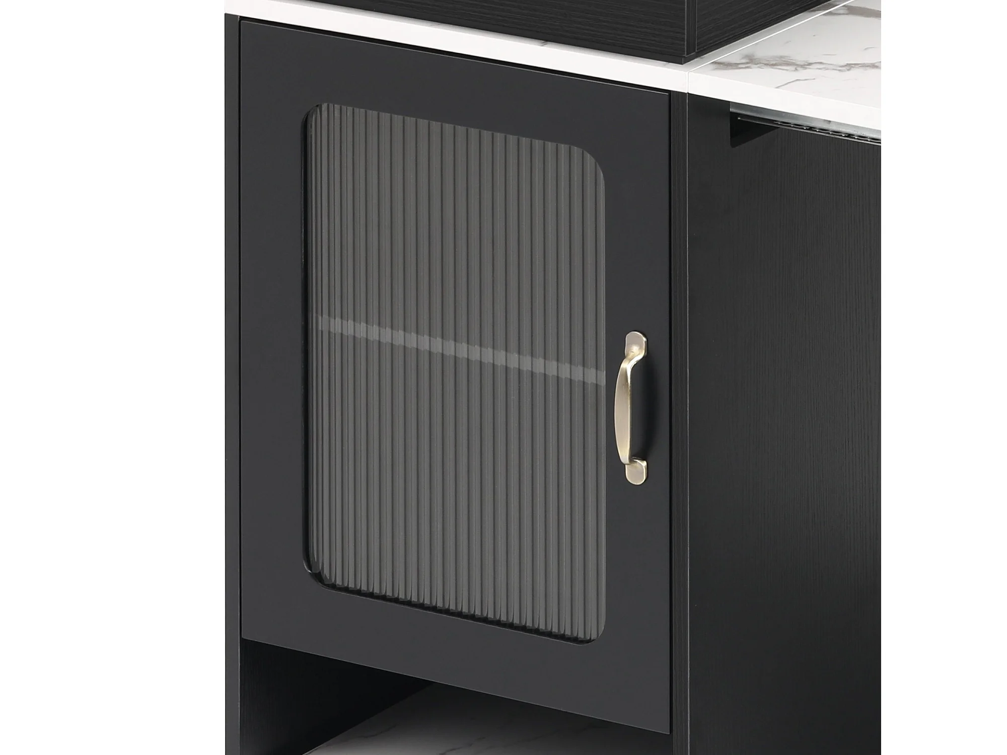 Ilha de cozinha - Com tomada elétrica - Com mesa de jantar removível e extensível - ​​Textura de mármore​​ - Com 1 porta - ​​Preto + Branco​