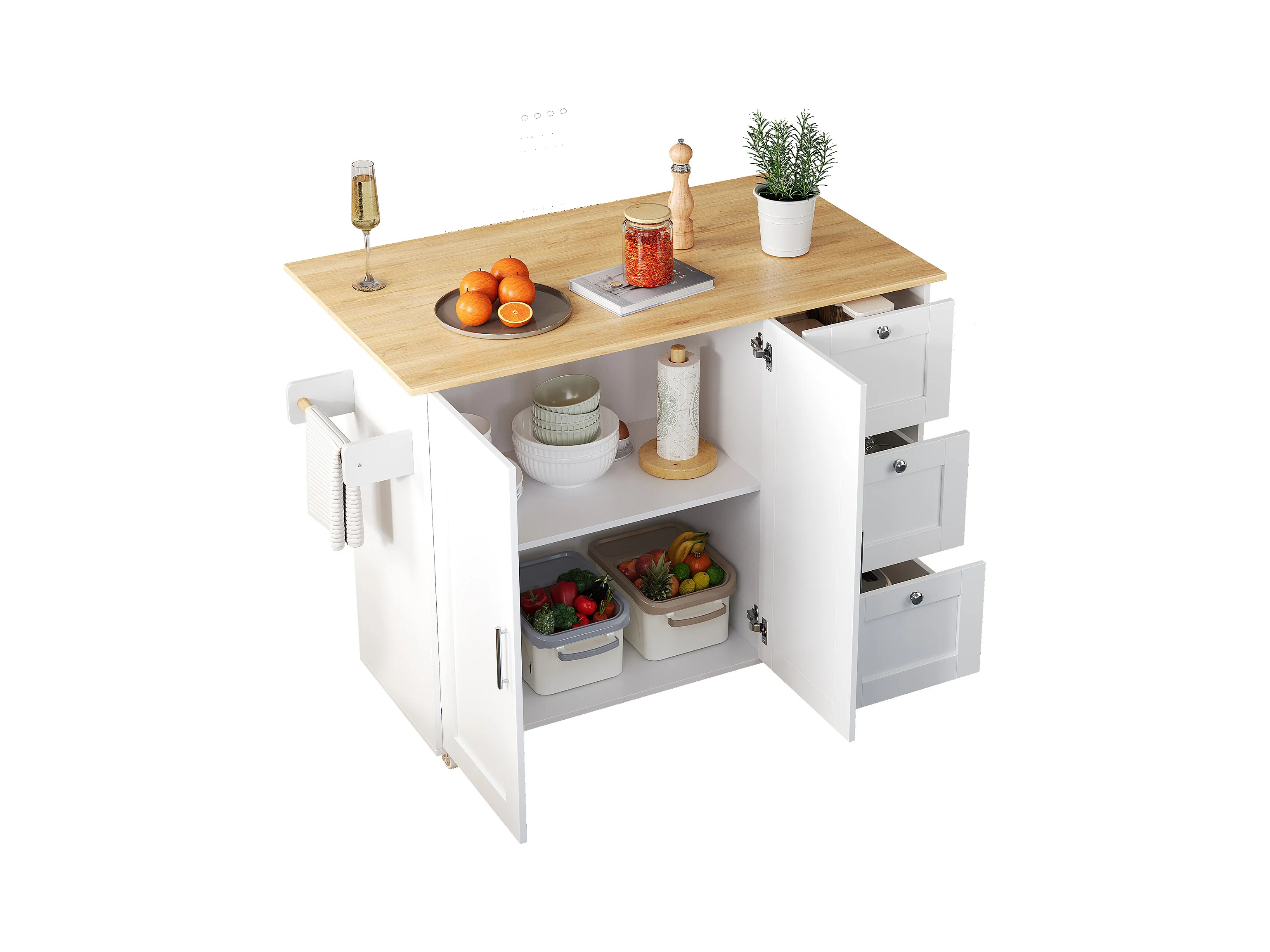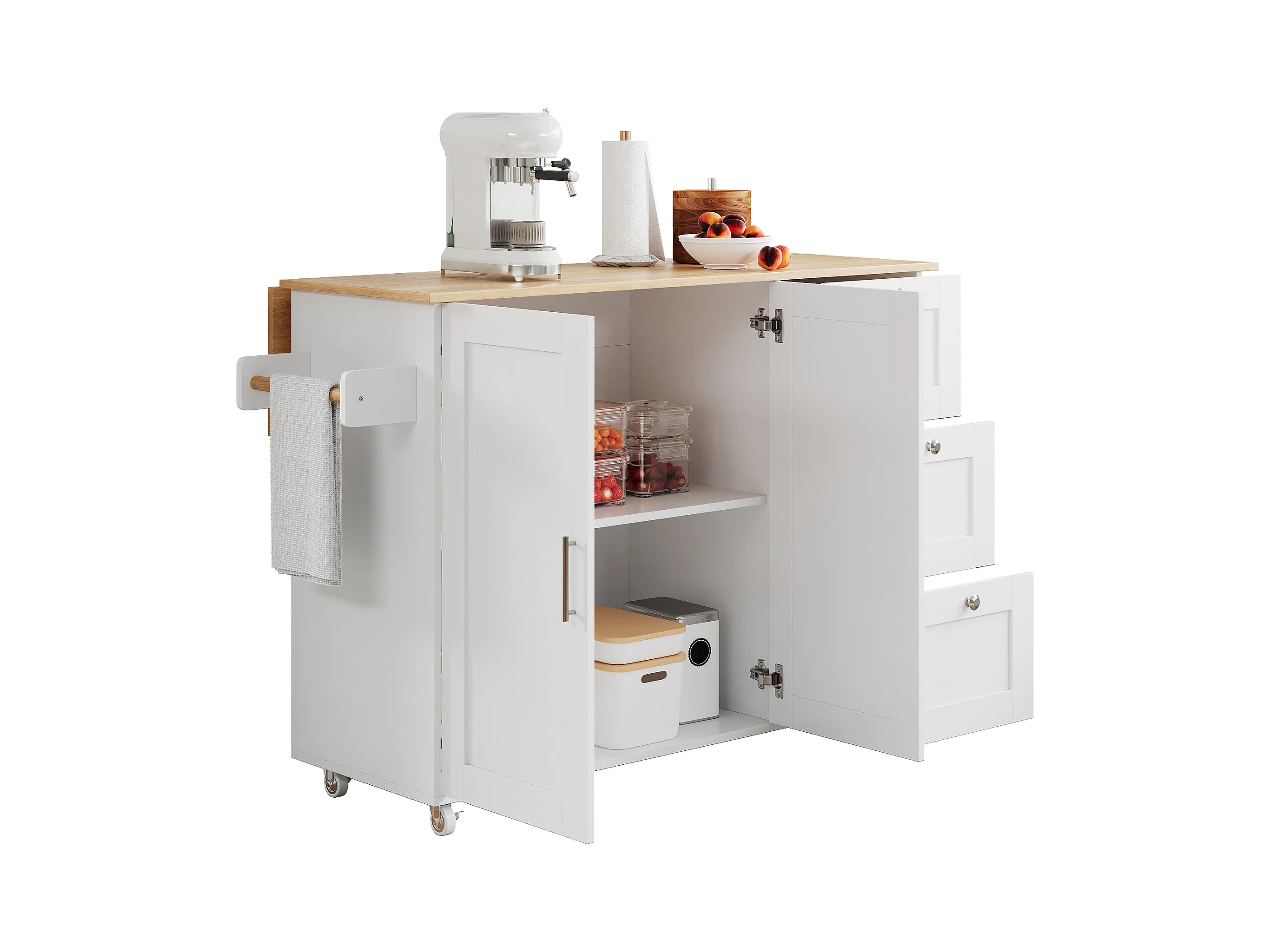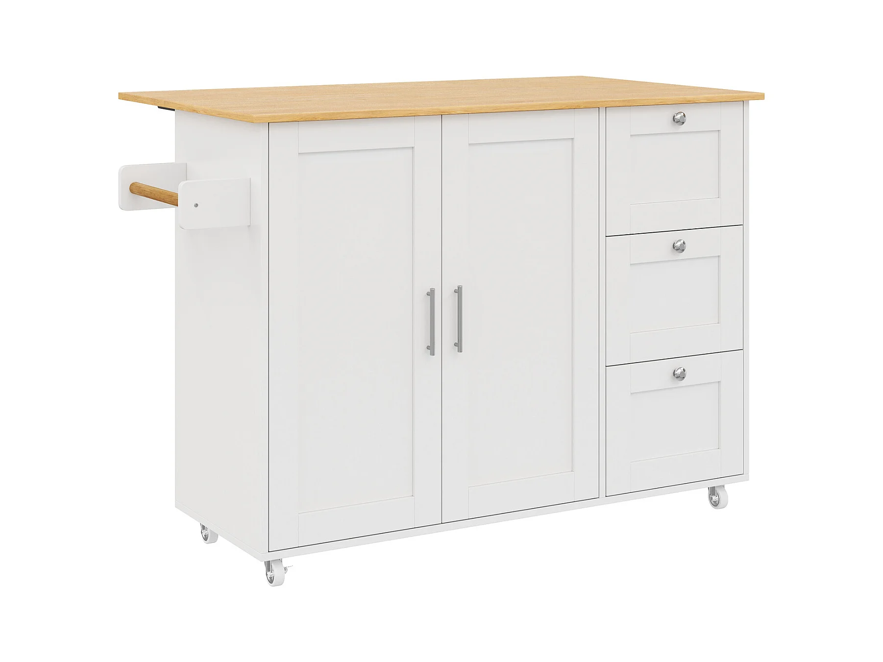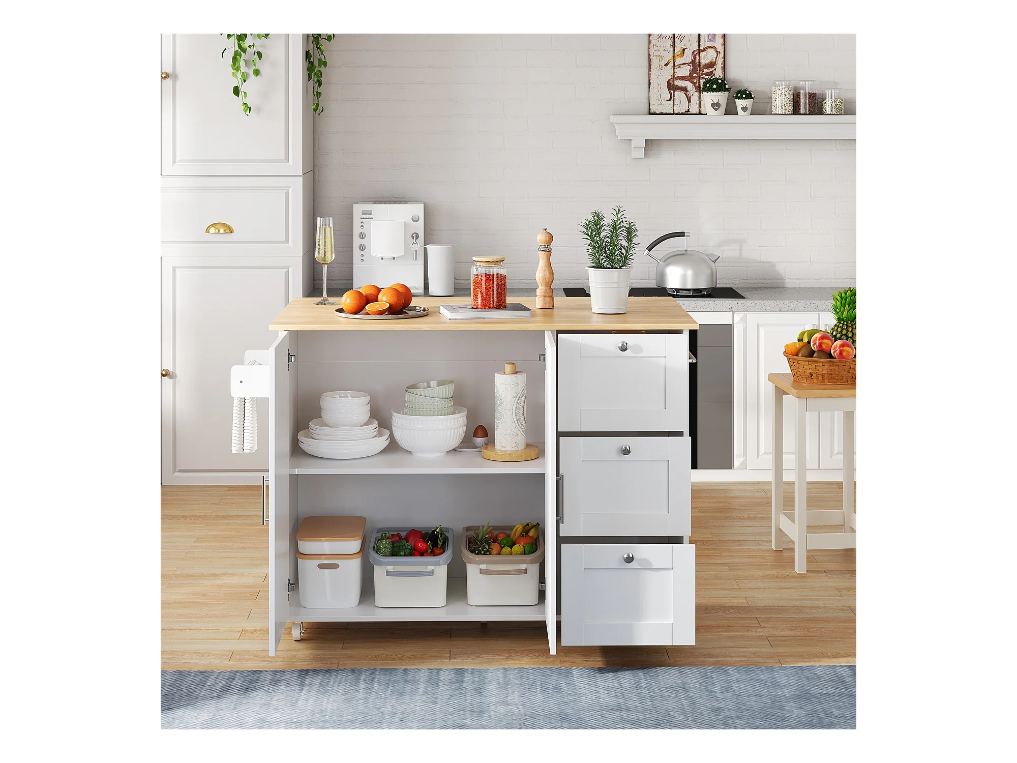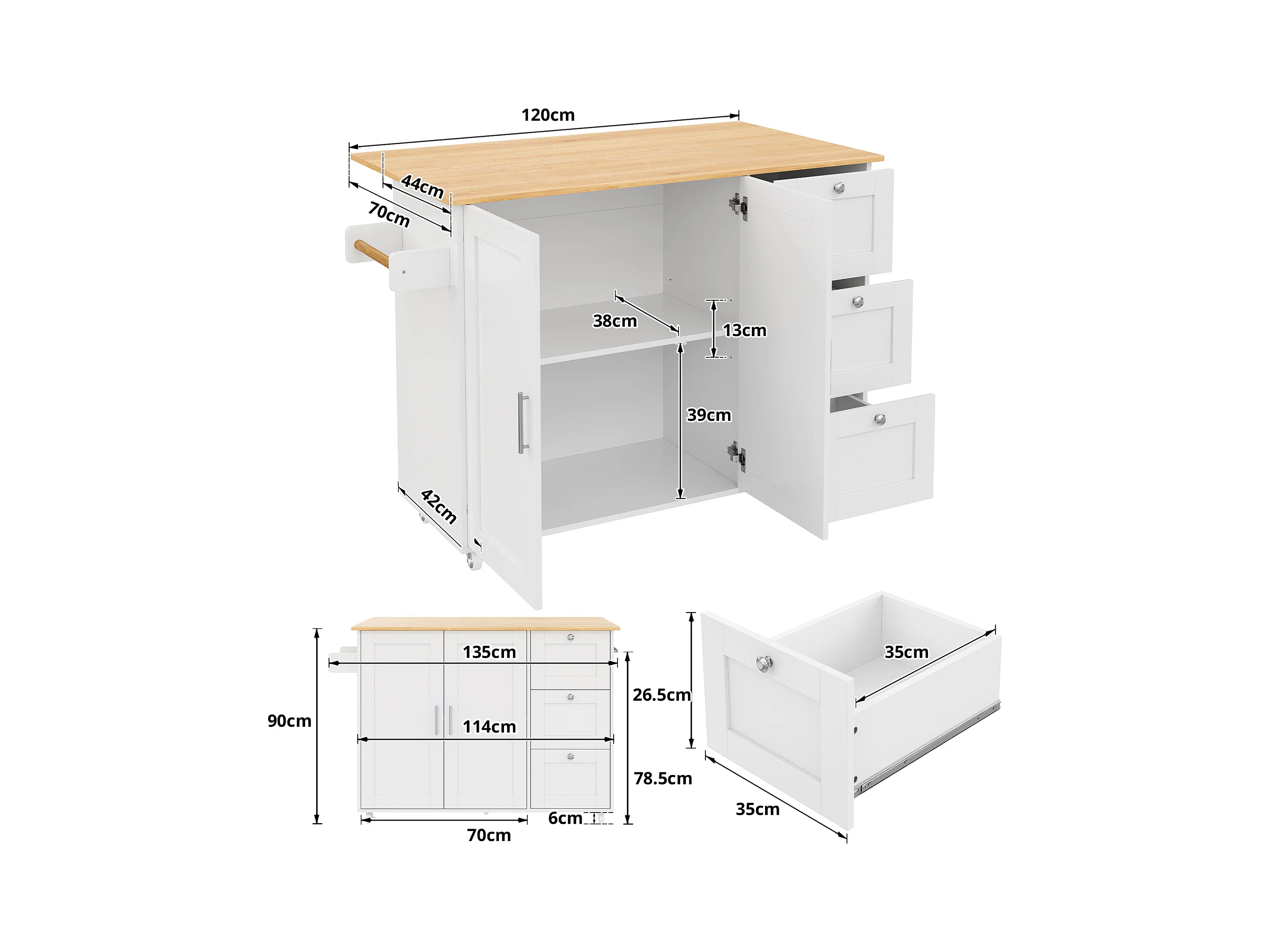 Ilha de cozinha móvel com 2 portas e 3 gavetas - Tampo extensível - 135x44(70)x90 cm - Madeira MDF - Branco e natural