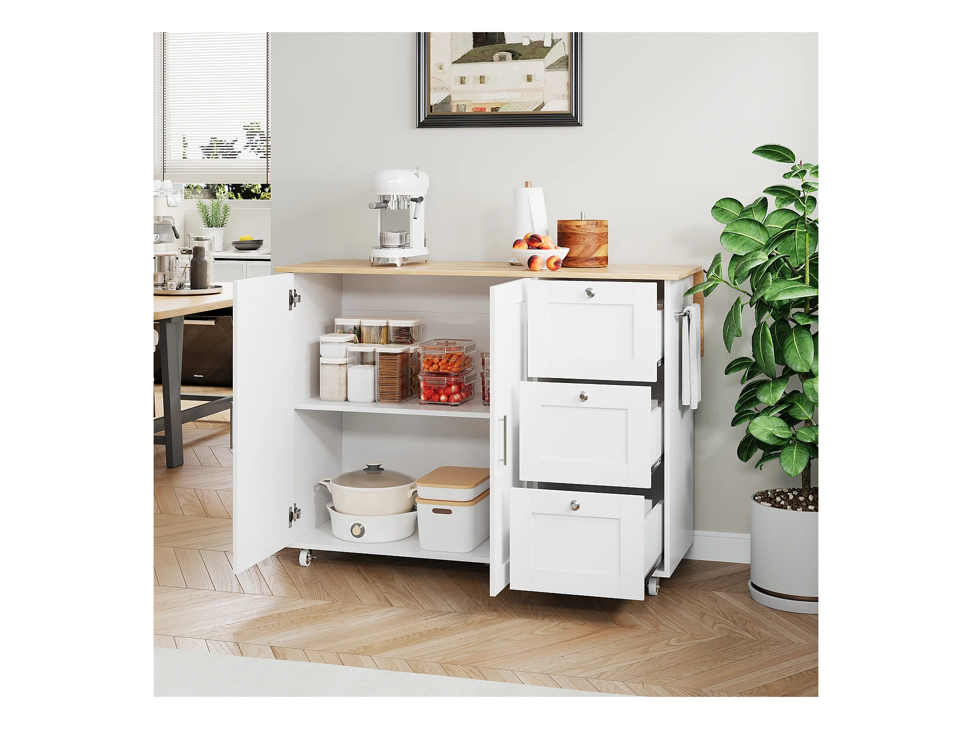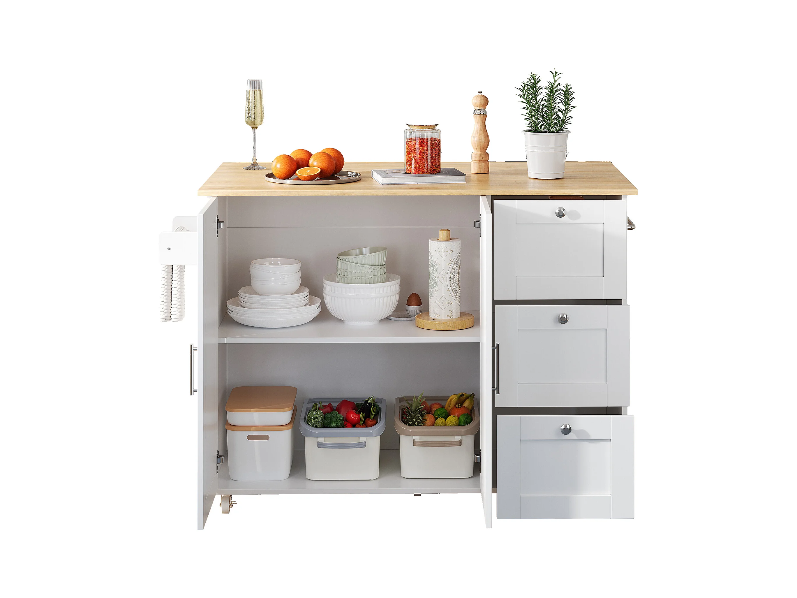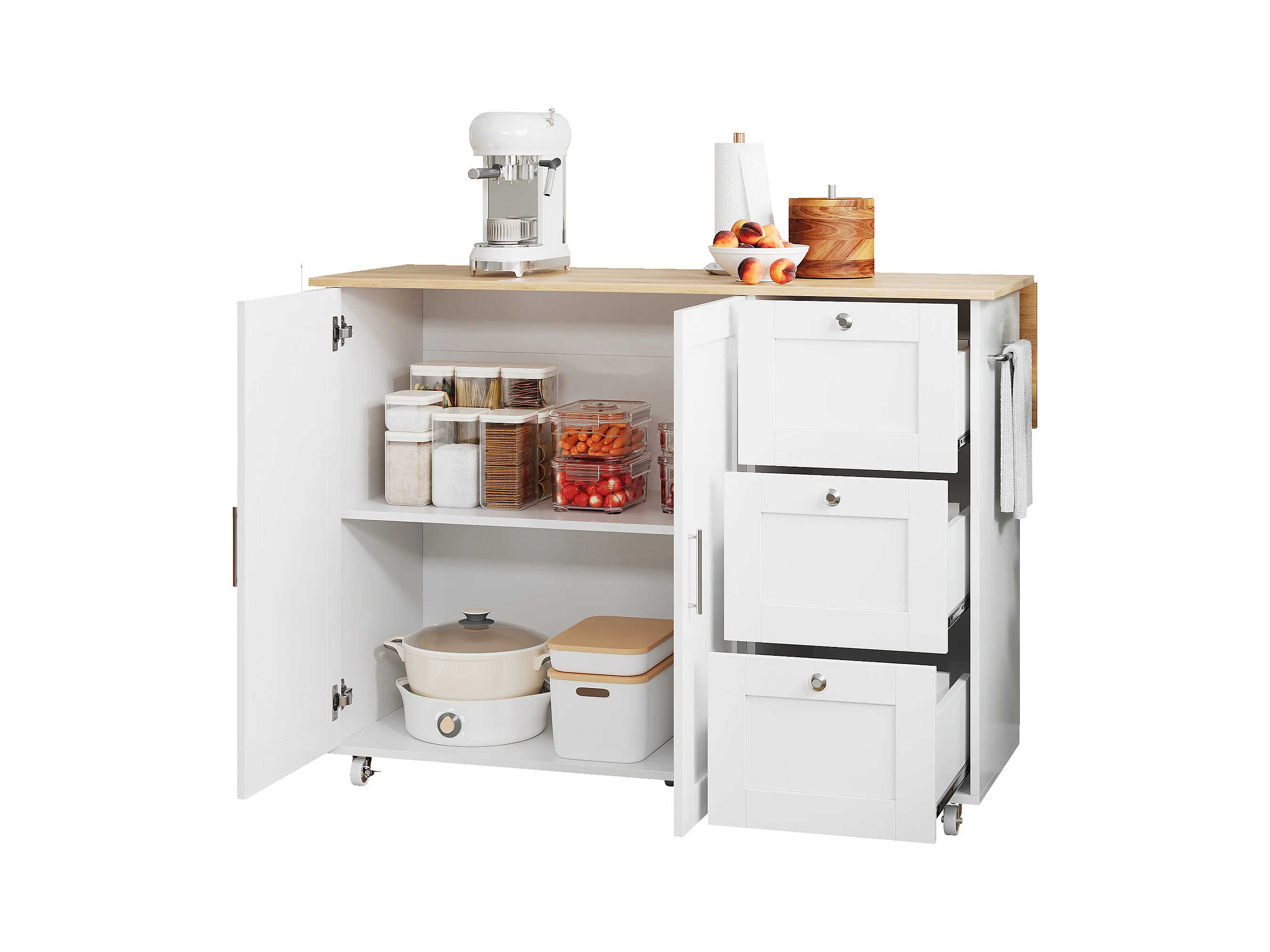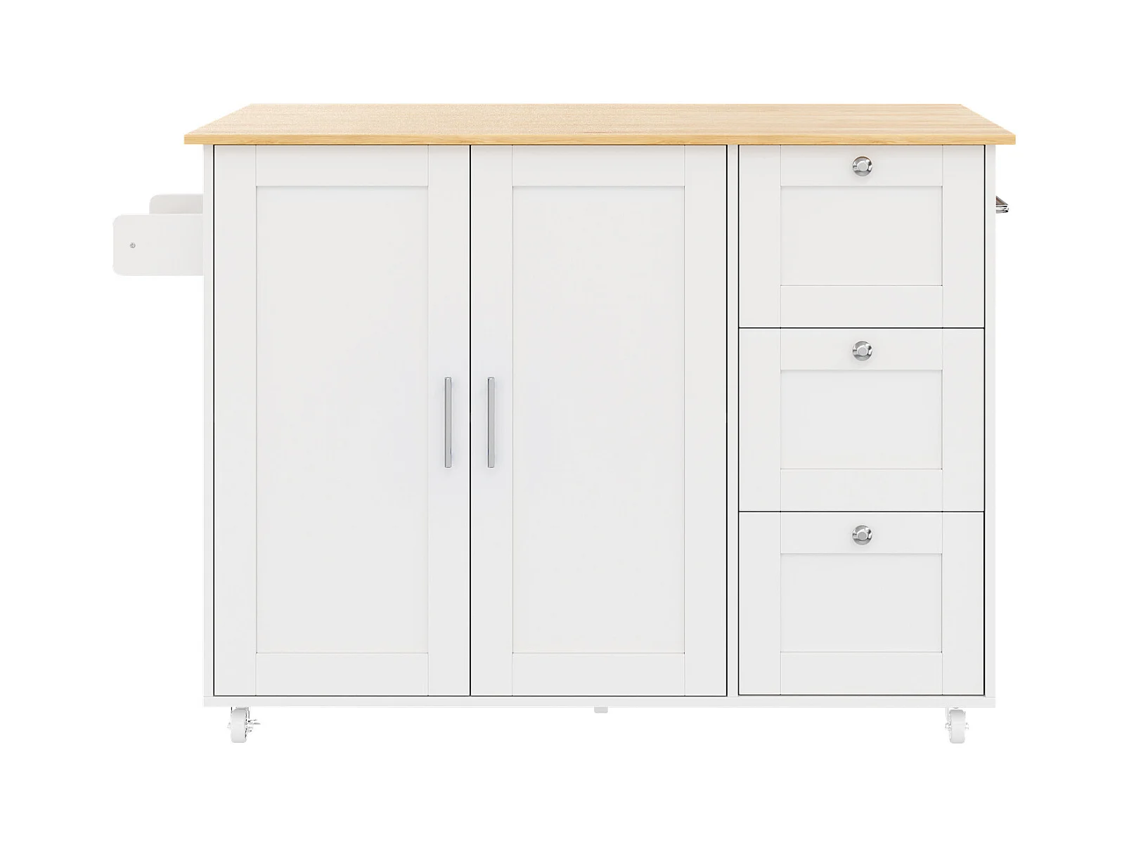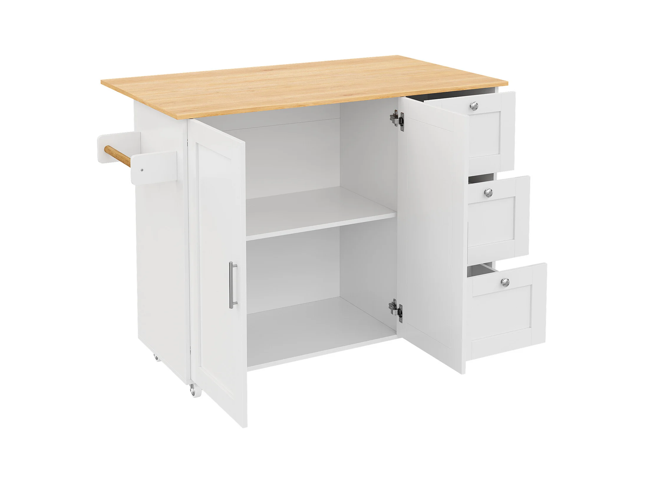 Ilha de cozinha móvel com 2 portas e 3 gavetas - Tampo extensível - 135x44(70)x90 cm - Madeira MDF - Branco e natural