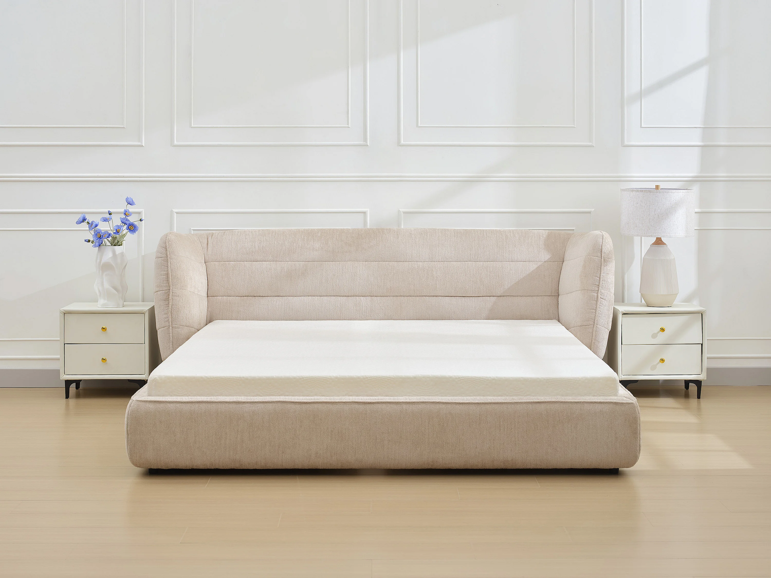 Cama 140x200 cm com cabeceira de cama curva, tecido bouclé bege + colchão - LARUMO de Maison Céphy