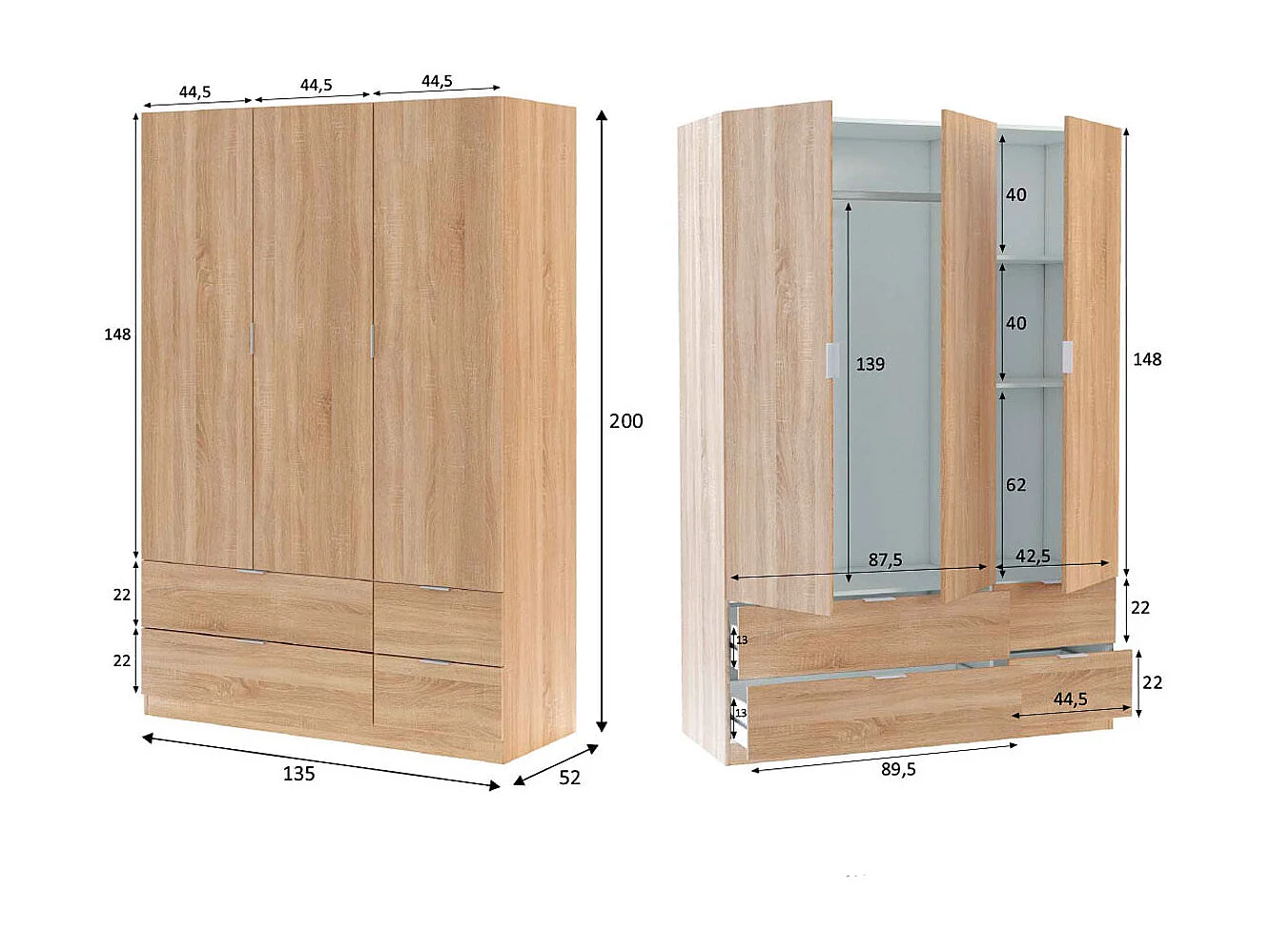 LCX 135 roupeiro 3 portas e 4 gavetas Roble Canadian