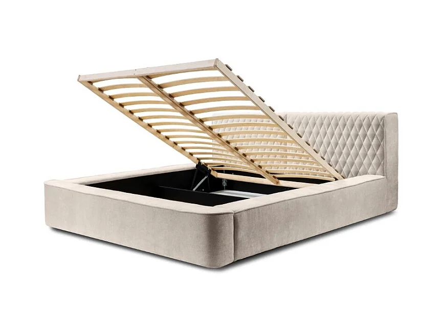 Cama baú CERVIN – Veludo macio Ocre rosado – 180x200 cm – Estrado elevatório – Design elegante