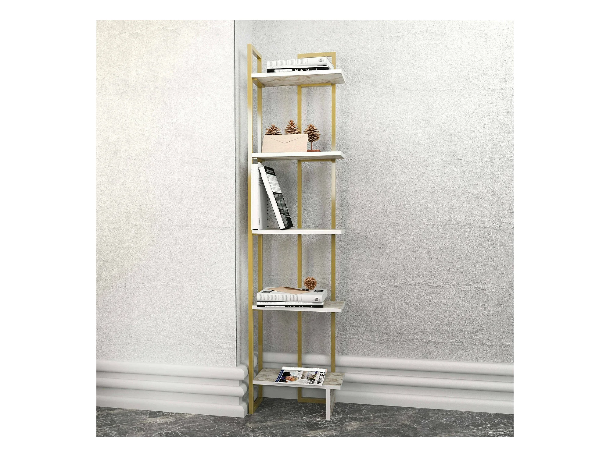 Livraria Dbradari, Prateleira de uffIcio, Porta-livros móvel, Biblioteca, 45x22h180 cm, Branco e Dourado