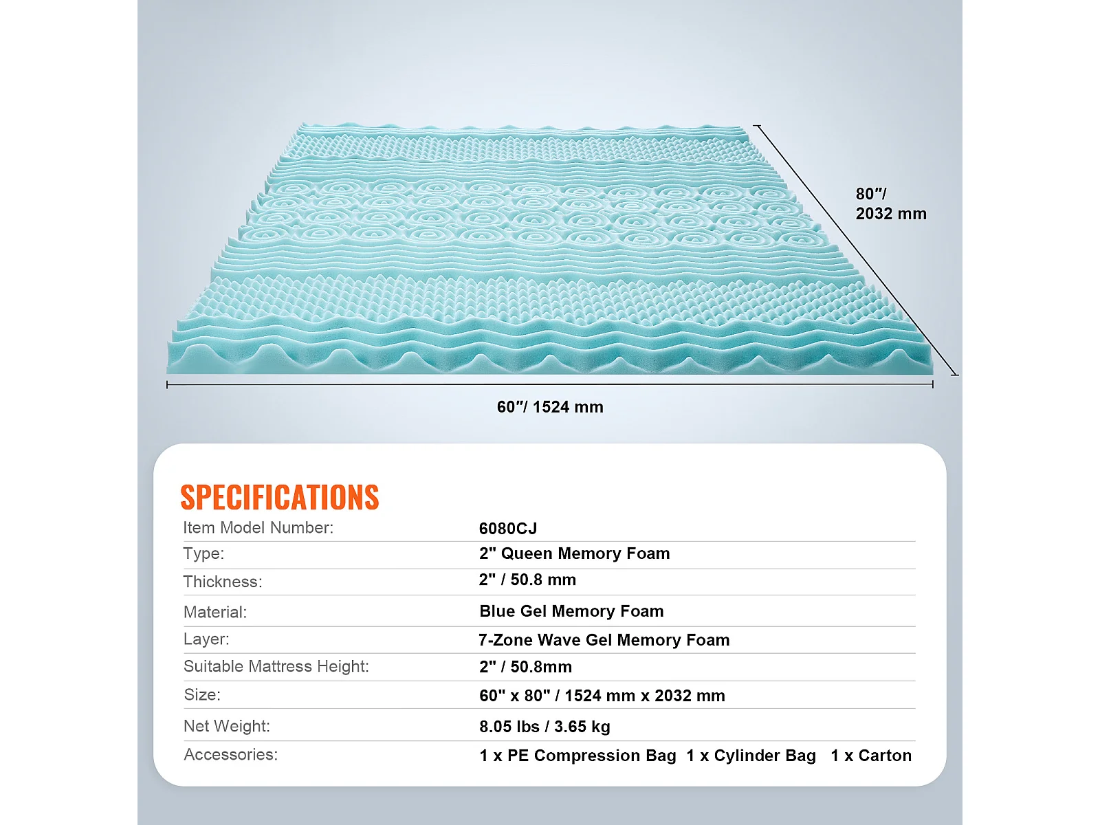 Manta SucceBuy de Espuma Memória, Tamanho Queen, Espessura 5,1 cm, Gel Refrigerante Suave