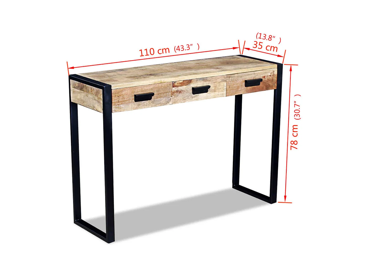 Mesa apoio 3 gavetas madeira de mangueira sólida 110x35x78 cm
