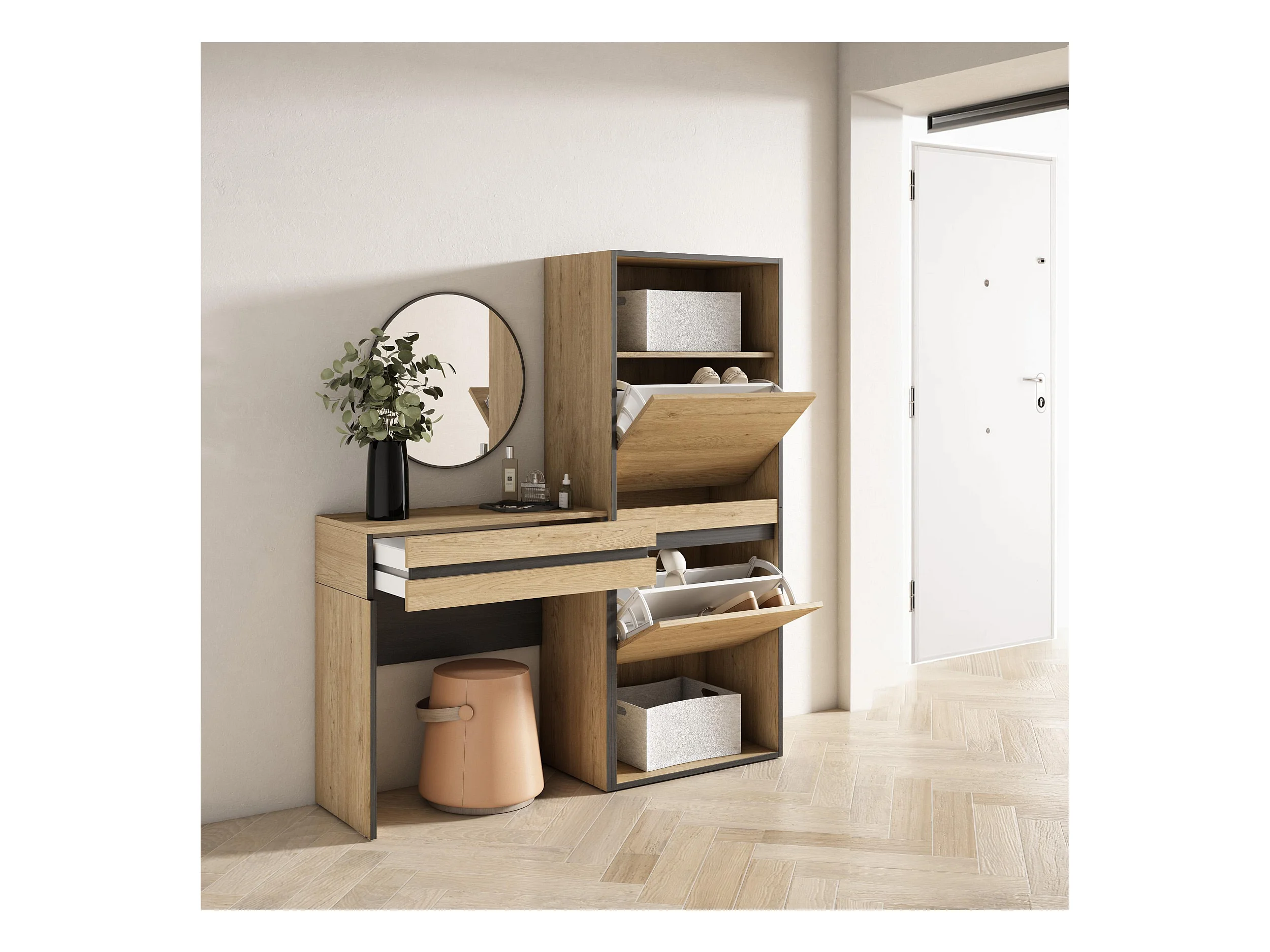 Mesa consola de entrada, 190x35x145cm, Com gaveta, Sapateira, Roupeiro aberto, Carvalho
