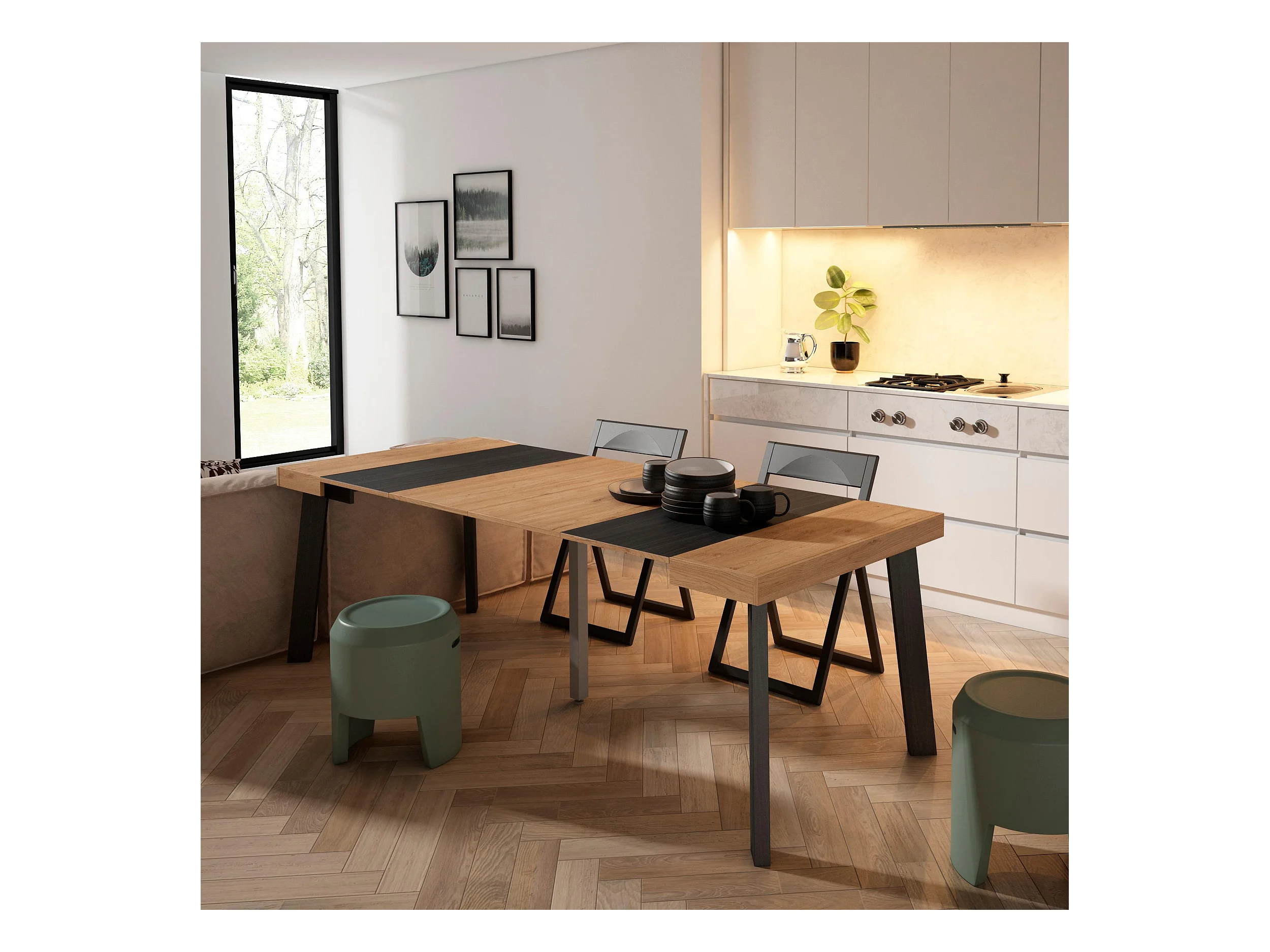 Mesa Consola Extensível, 180x90x73cm, Para 8 pessoas, Pés de madeira, Carvahlo e preto