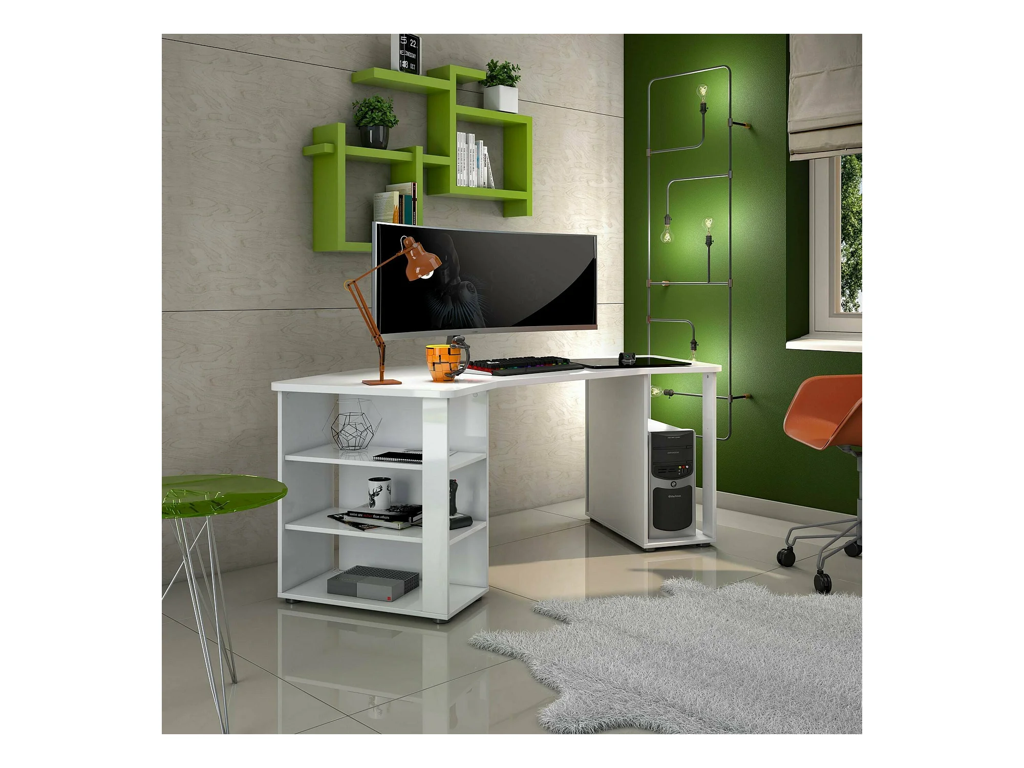 Secretária DcharPentie, Mesa de canto com prateleiras de armazenamento, Mesa de escritório multiuso com salto, 180x60h93 cm, Branco